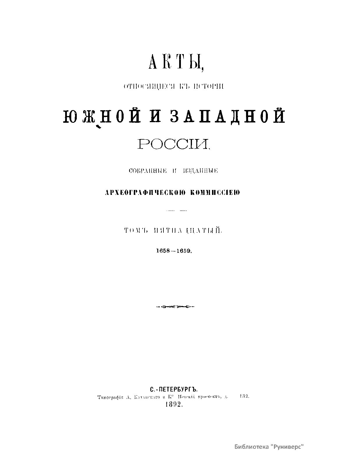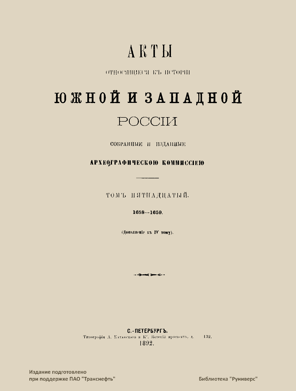 Акты, относящiеся къ исторiи южной и западной Россiи. Томъ пятнадцатый. 1658-1659. (Дополненiе къ IV тому)
