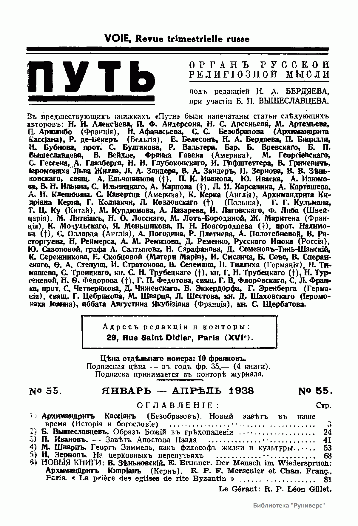 Путь: Орган русской религиозной мысли. №55. Январь-Апрель 1938