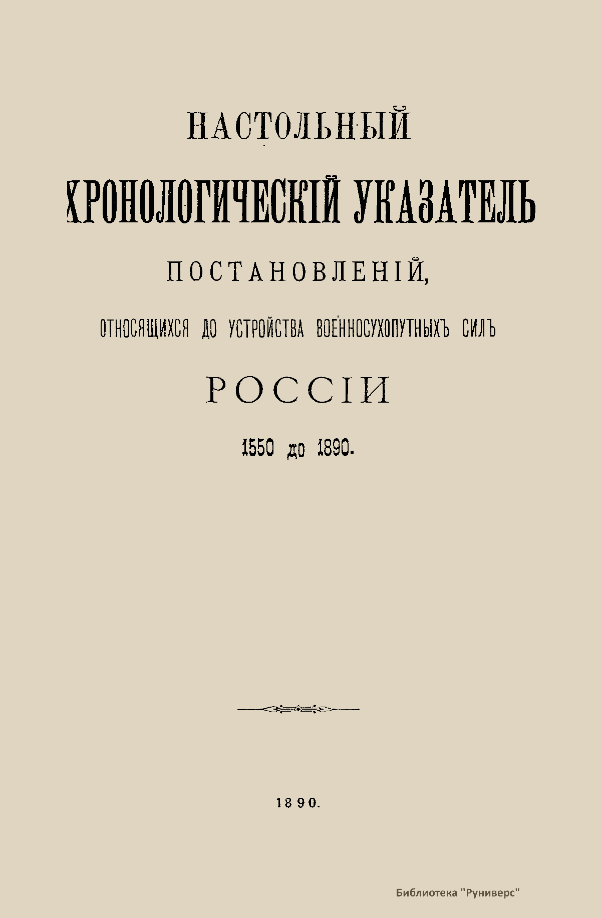 Настольный хронологическiй указатель постановленiй, относящихся до устройства военносухопутныхъ силъ Россiи 1550 до 1890