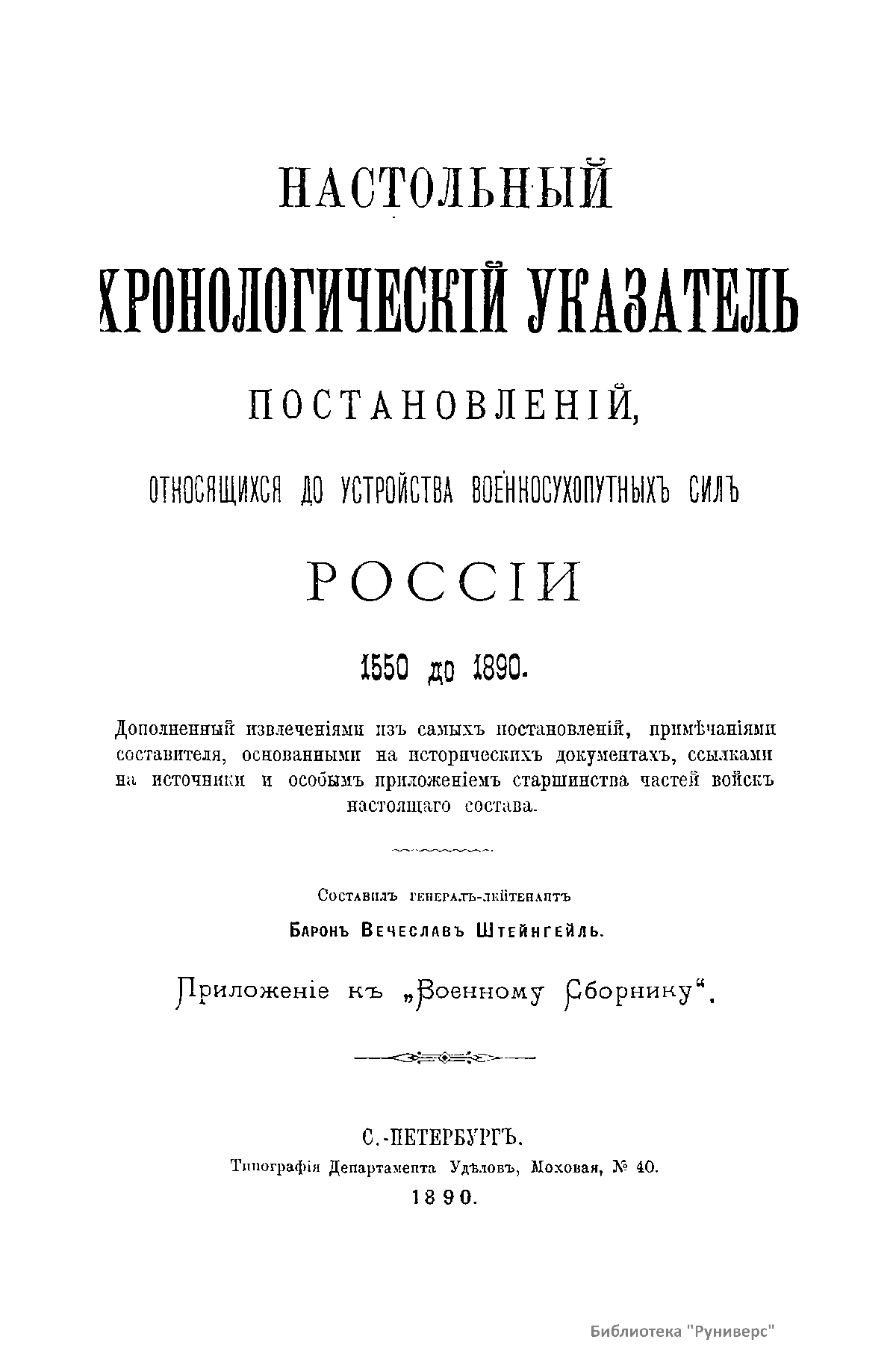 Настольный хронологический указатель постановлений, относящихся до устройства военносухопутных сил России 1550 до 1890