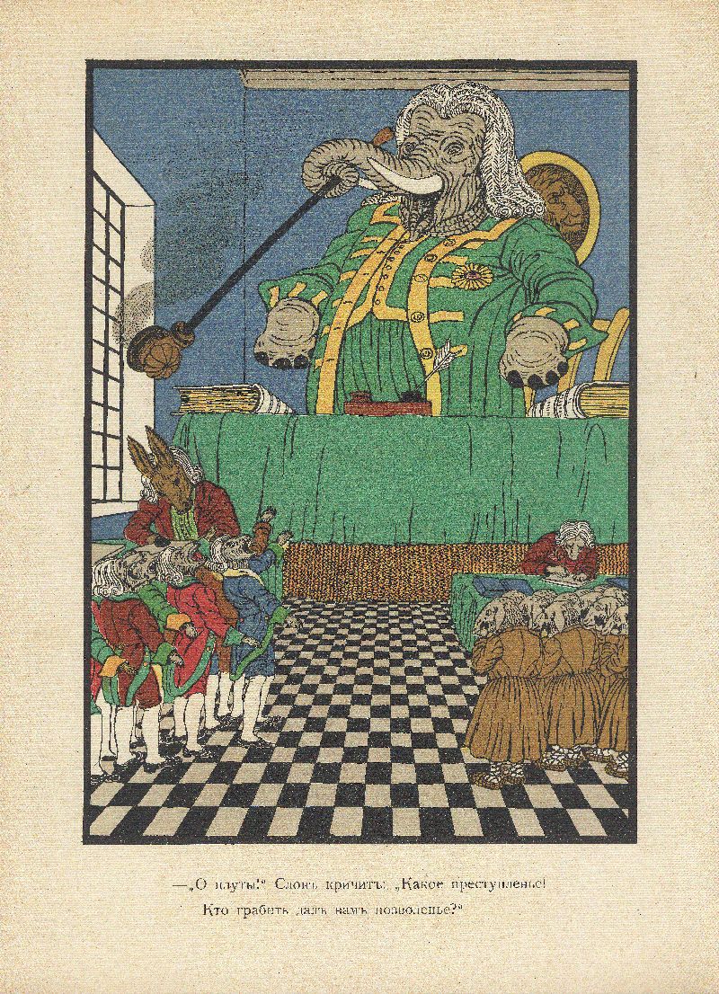 Возможно, Кнебель хотел привлечь к иллюстрированию басен различных художников. Так, например, издание 1912 года иллюстрирует Егор Нарбут. Серия оформлена в стилистике классицизма – своеобразная дань Крылову и его эпохе. Иллюстрации Тиморева на первый взгляд могут показаться не особо изящными. Они выполнены яркими красками против черно-белых точеных силуэтов Нарбута и написаны слишком натуралистично. Такие иллюстрации не соответствуют художественной эстетике начала ХХ века, но, возможно, именно такова и была задумка Кнебеля и Тиморева – изобразить героев басен в классицистическом стиле.