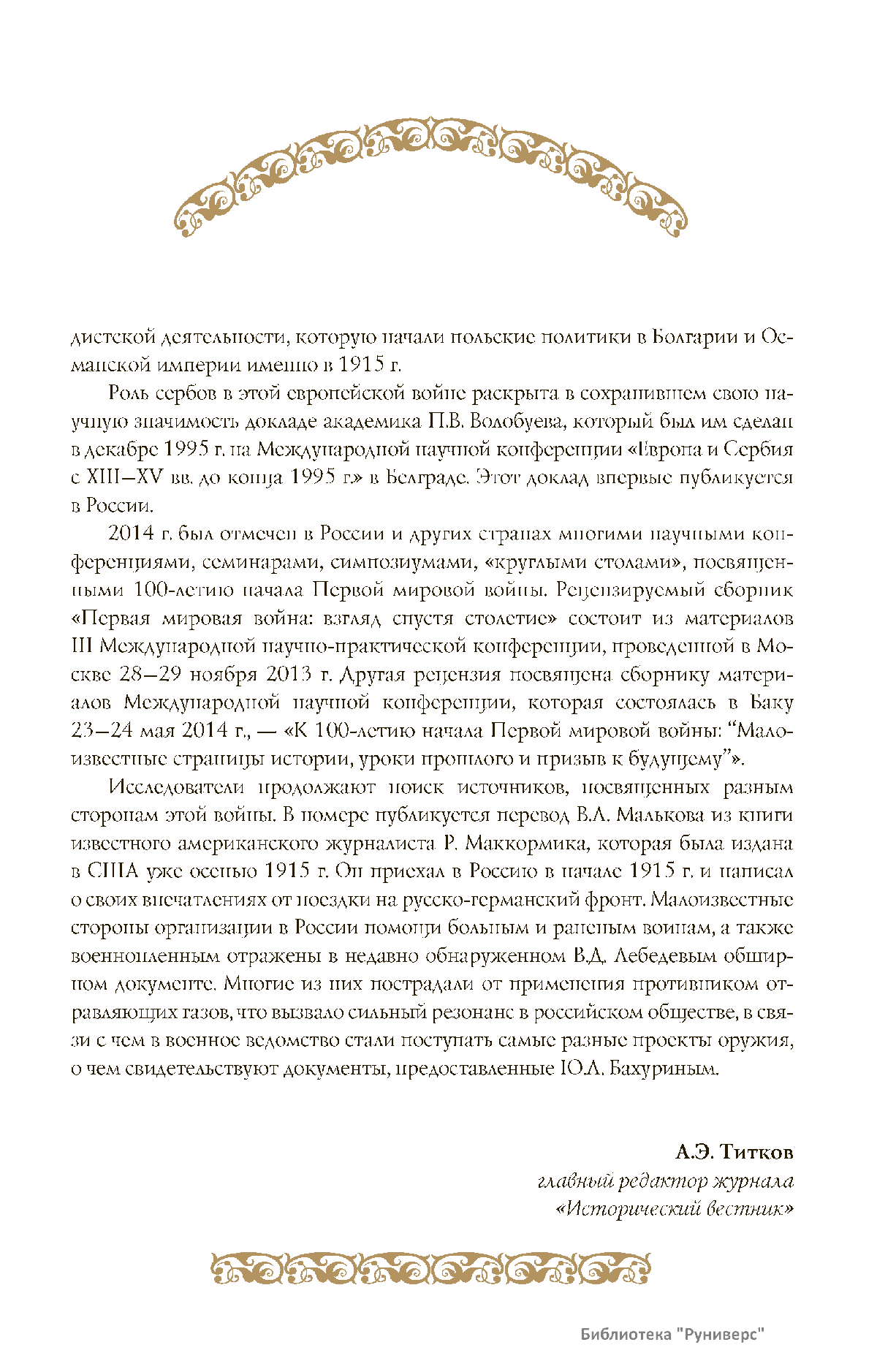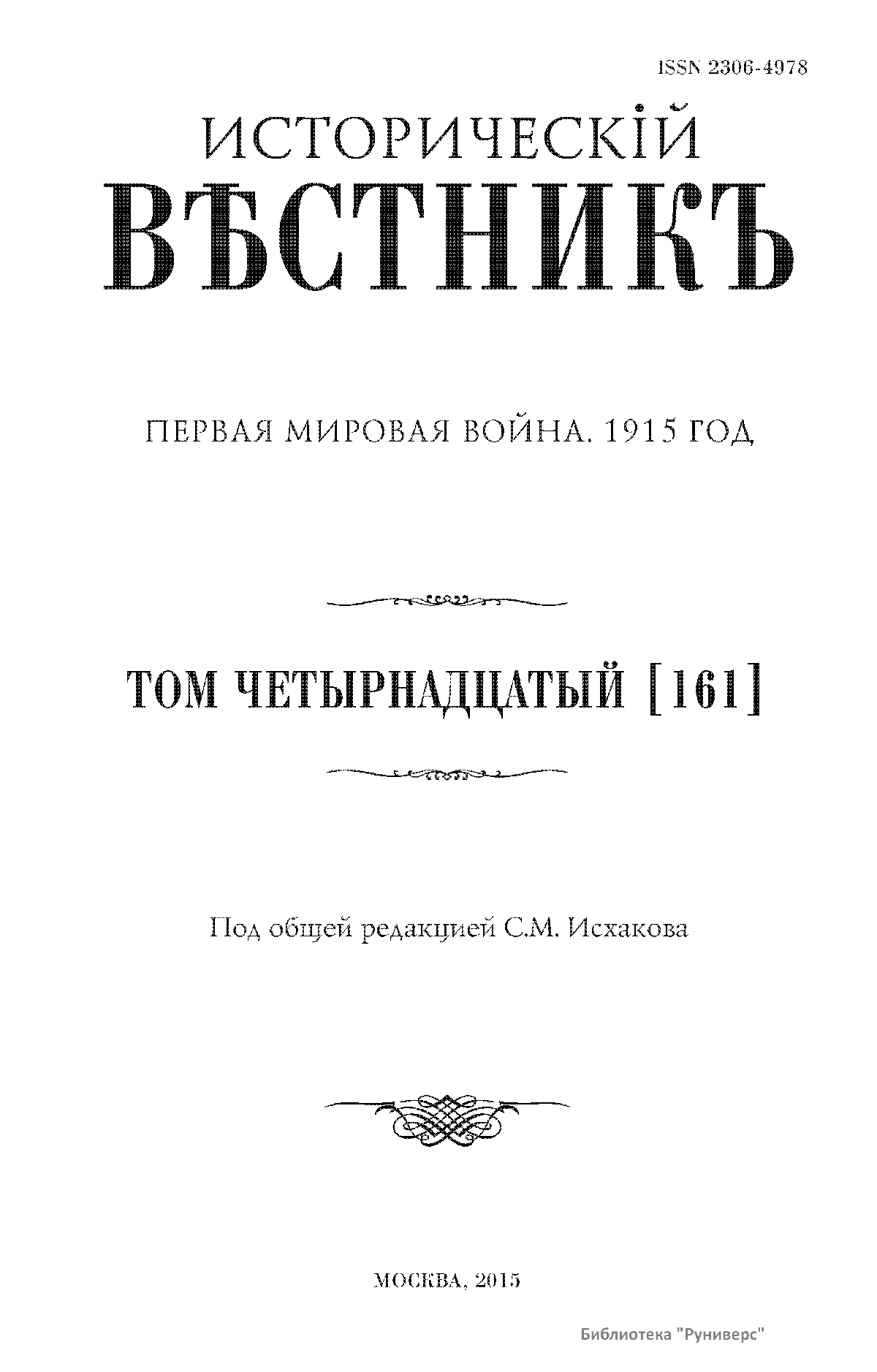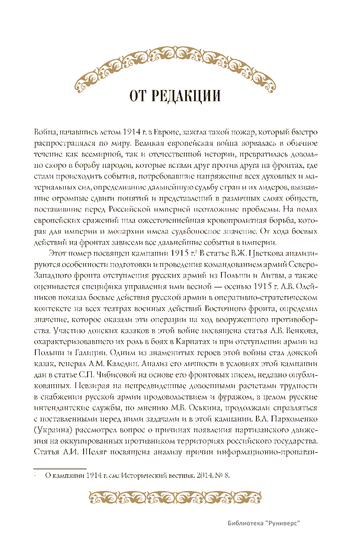 Дорогие коллеги, мы представляем вам первый номер «Исторического вестника», который одновременно обозначается 148-м томом, тем самым продолжая дореволюционное издание. Однако, перешагивая почти сто лет, мы понимаем, что реалии XXI века определяют и новое содержание журнала. История сегодня во многом актуализирована политикой. Именно геополитическая ситуация в мире, возвращающая нас к вопросам сохранения существующих границ, национальных и культурных ценностей, моральных и религиозных принципов, формирует еще одно измерение — проблему аутентичного исторического бытования народов и государств. С одной стороны, это вопрос географических ареалов государственных образований, с другой — тема, связанная с соприкосновением, взаимодействием процессов, культур и традиций. Во многом мы стоим и перед важнейшей этической проблемой. Мы должны не только вежливо и настойчиво указывать нашим уважаемым соседям на свои исторические права, но и сами уходить от искушения искусственного удревнения собственной истории или присвоения чужой. И здесь на сцену выходит его величество Исторический Научный Факт. Он и есть главный цензор и законодатель. На этом незыблемом основании будет строиться редакционная и научная работа «Исторического вестника».