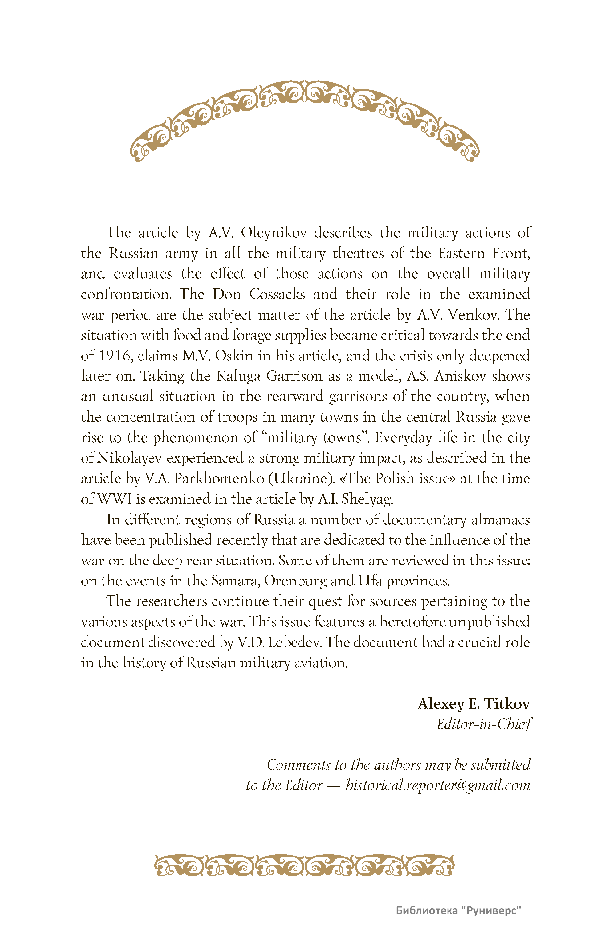 Дорогие коллеги, мы представляем вам первый номер «Исторического вестника», который одновременно обозначается 148-м томом, тем самым продолжая дореволюционное издание. Однако, перешагивая почти сто лет, мы понимаем, что реалии XXI века определяют и новое содержание журнала. История сегодня во многом актуализирована политикой. Именно геополитическая ситуация в мире, возвращающая нас к вопросам сохранения существующих границ, национальных и культурных ценностей, моральных и религиозных принципов, формирует еще одно измерение — проблему аутентичного исторического бытования народов и государств. С одной стороны, это вопрос географических ареалов государственных образований, с другой — тема, связанная с соприкосновением, взаимодействием процессов, культур и традиций. Во многом мы стоим и перед важнейшей этической проблемой. Мы должны не только вежливо и настойчиво указывать нашим уважаемым соседям на свои исторические права, но и сами уходить от искушения искусственного удревнения собственной истории или присвоения чужой. И здесь на сцену выходит его величество Исторический Научный Факт. Он и есть главный цензор и законодатель. На этом незыблемом основании будет строиться редакционная и научная работа «Исторического вестника».