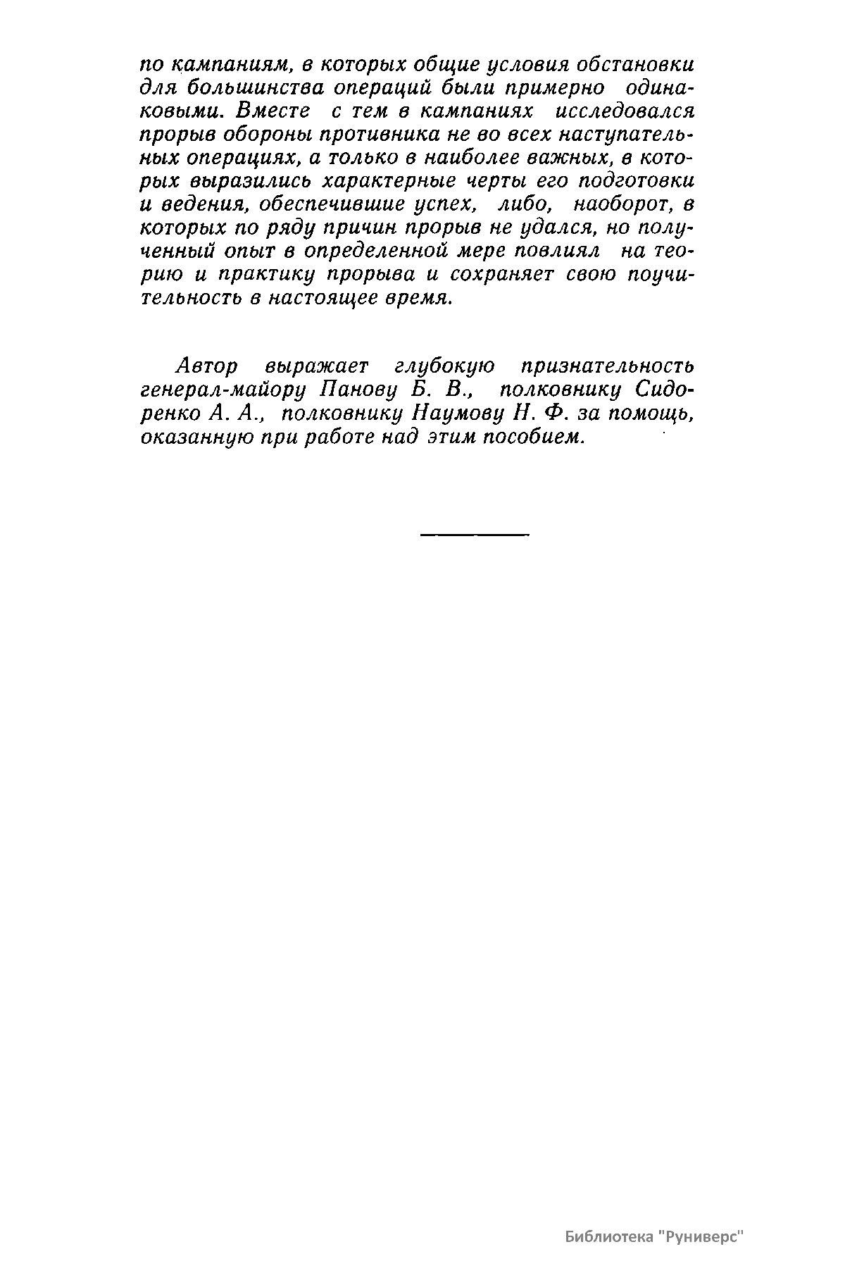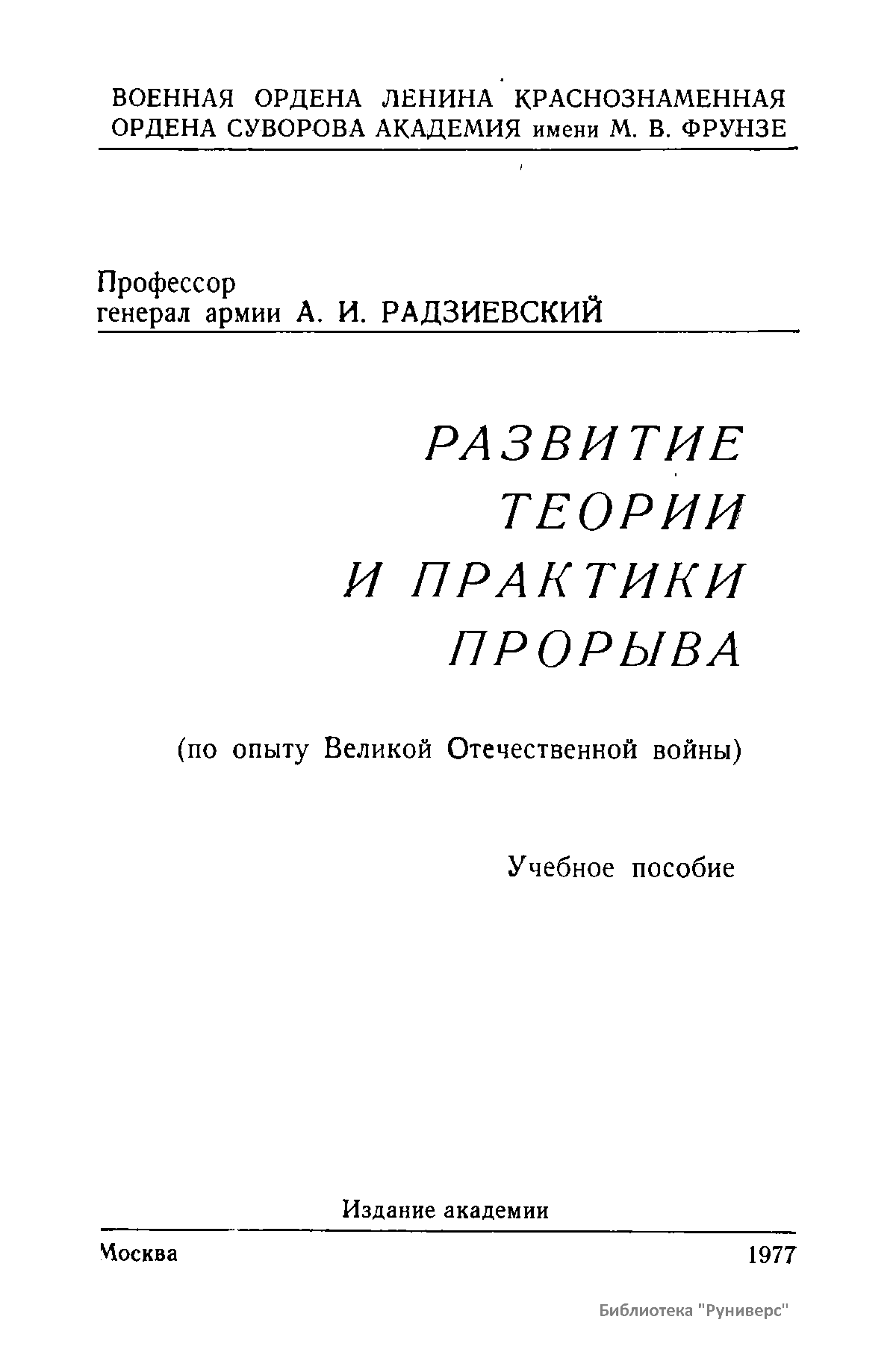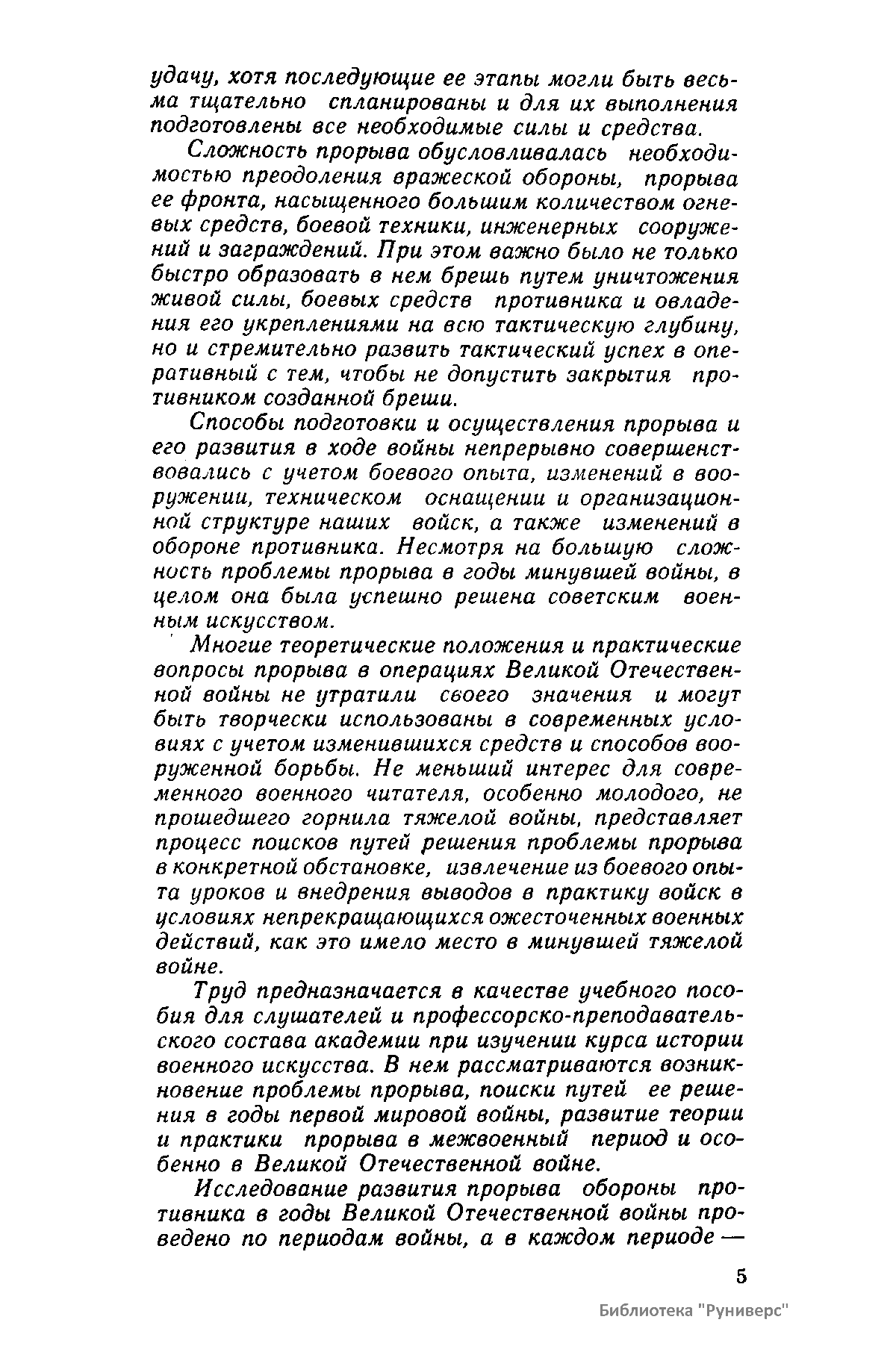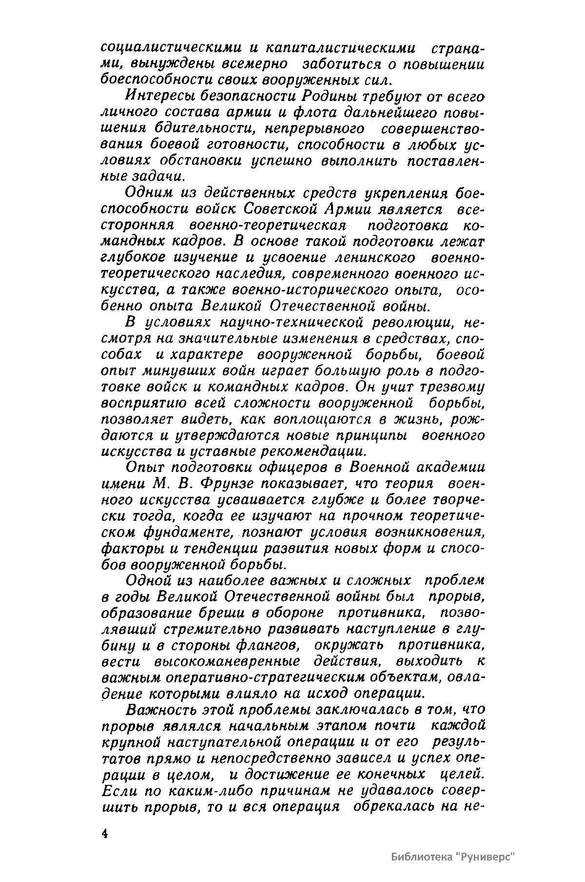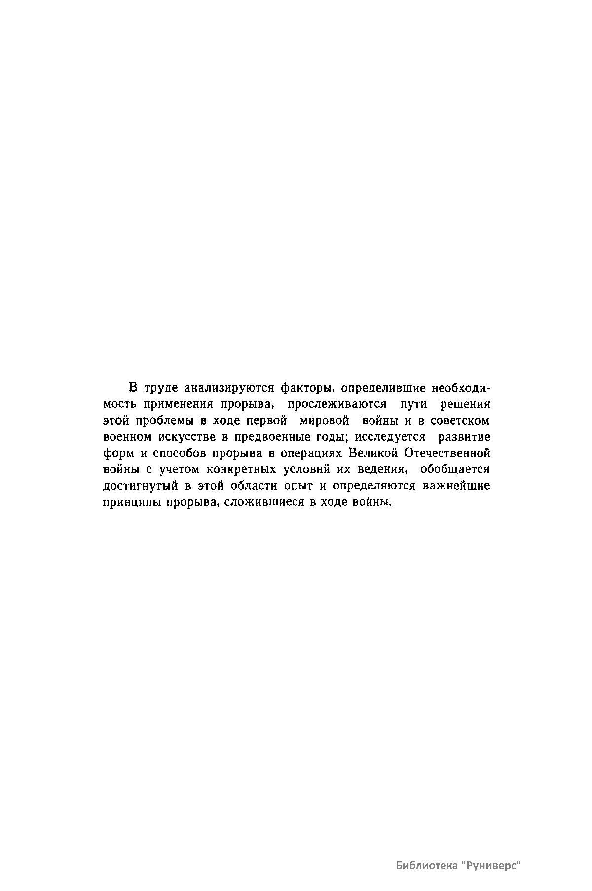 В труде анализируются факторы, определившие необходимость применения прорыва, прослеживаются пути решения этой проблемы в ходе Первой Мировой войны и в советском предвоенном искусстве в предвоенные годы; исследуется развитие форм и способов прорыва в операциях Великой Отечественной войны с учетом конкретных условий их ведения, обобщается достигнутый в этой области опыт и определяются важнейшие принципы прорыва, сложившиеся в ходе войны.