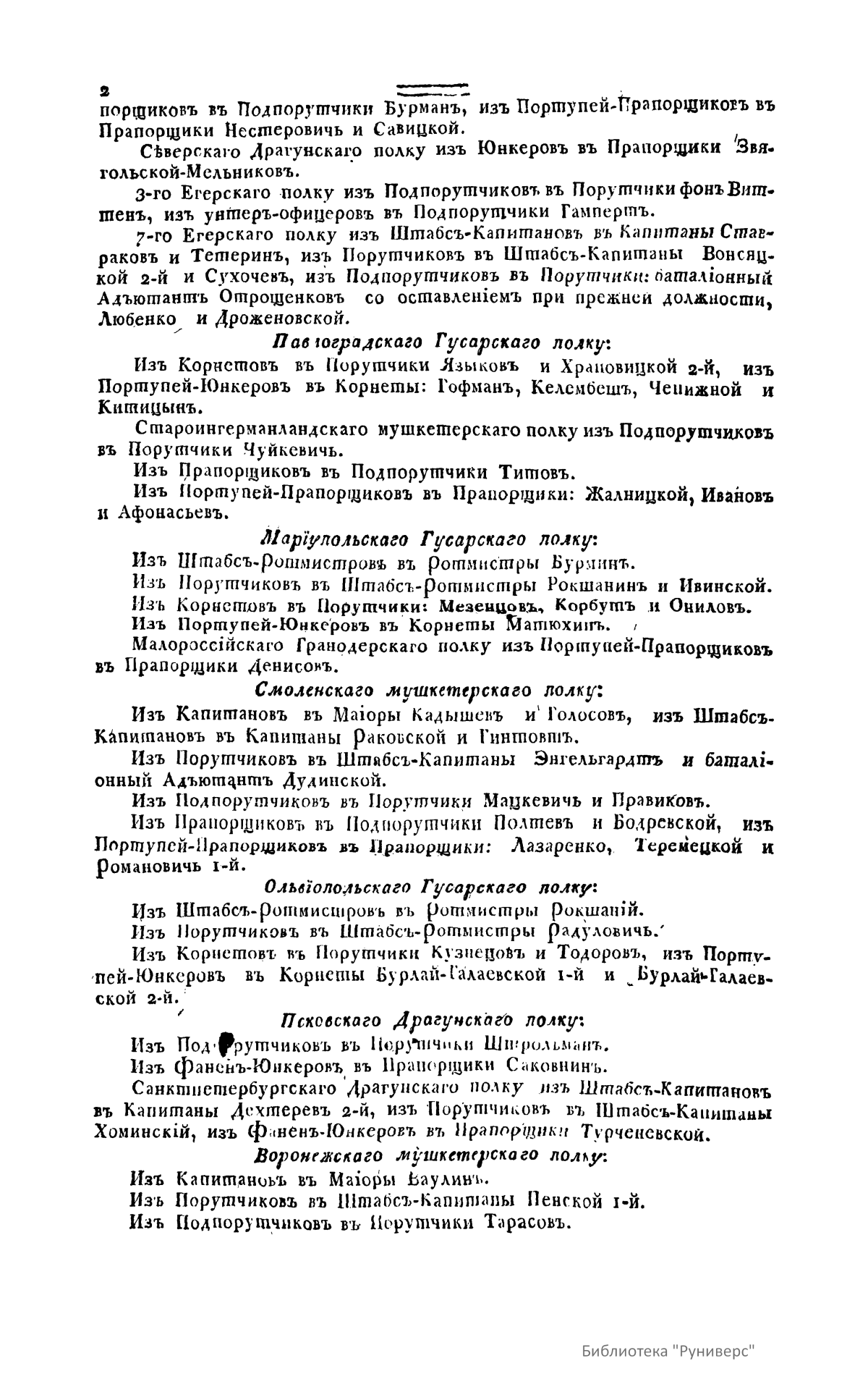 Первоначально в высочайшие приказы включали всех как офицеров, так и военных чиновников армии и флота. После 1807 года флотские чины стали публиковаться отдельно от армейских, а впоследствии они оформились в высочайшие приказы по морскому ведомству, в отличие от высочайших приказов о чинах военных. С середины XIX века отдельно стали публиковаться высочайшие приказы о чинах гражданских военного ведомства, причем эти приказы издавались под номерами (около 50 в год), в отличие от высочайших приказов о чинах военных, номеров не имевших. Помимо самих приказов, издавались и дополнения к ним, причем иногда по несколько дополнений к одному приказу. Во второй половине XIX века в высочайших приказах стали публиковать и награждения всех офицеров армии. Большим минусом является отсутствие алфавитов к высочайшим приказам: они имеются только за период с 1817 по 1833 год. Последний из опубликованных алфавитов – за 1860 год. Однако современные технические возможности позволяют избежать зависимости от алфавитов. С 1817 по 1833 год включительно высочайшие приказы публиковались по третям. В XVIII и XIX веках год делился не на четыре квартала по три месяца, а на три трети по четыре месяца (январскую, майскую и сентябрьскую). Так же по третям и выплачивалось жалованье.
