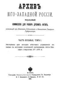 В серии «Архив Юго-Западной России» были напечатаны документы Киевского архива. Издание было предпринято Киевской археографической комиссией с 1859 по 1911 год. Всего вышло 34 тома.