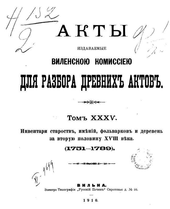 Обилие актов и документов Виленского центрального архива (19244 актовых книг) и желание исследовать прошлое Литвы, которая и в старину принадлежала России, вызвали после 1863 года учреждение особой комиссии для разбора в городе Вильне древних актов.