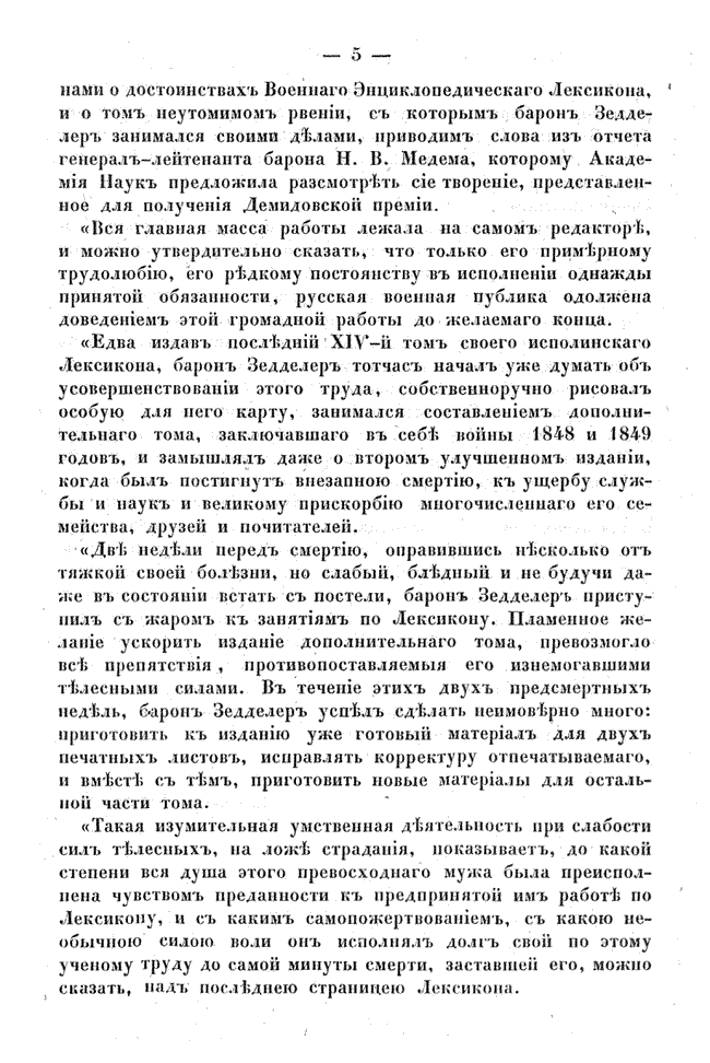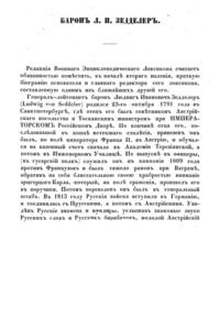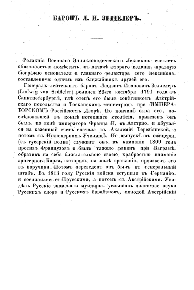 Военный энциклопедический лексикон впервые издавался с 1837 по 1850 год и насчитывает 14 основных томов и один дополнительный (вышел в 1852 г.). Этот огромный труд обязан своим появлением почти исключительно энергии и настойчивости его редактора барона Л. И. Зедделера, на котором лежала вся основная масса работы. По сути своей «Лексикон» являлся первой русской военной энциклопедией (до него выходил только двухтомный «Военный словарь» С. А. Тучкова, в 1818 г.). Несмотря на довольно холодный приём военными кругами первых выпусков «Лексикона», выходившего небольшими книжками (известно, что первая часть состояла из четырёх отдельных книжек) через значительные промежутки времени и стоившего в продаже весьма немалых денег, Зедделер настойчиво занимался его изданием, вложив, помимо личного труда, и значительную часть своего состояния, и в течение 13 лет привёл его к окончанию. Программа «Лексикона» была намечена чрезвычайно широко, имея в виду крайне низкий образовательный уровень армейского офицерства времён императора Николая I и трудность пополнения общего образования при глухих стоянках и постоянном передвижении полков с места на место. В силу этого в «Лексикон» включён ряд сведений, весьма отдалённо связанных с военным делом. Барону Зедделеру удалось привлечь к составлению «Лексикона» наиболее выдающихся военных и учёных Николаевского времени, среди которых особо выделяются К. Ф. Багговут, М. И. Богданович, К. М. Базили, А. В. Висковатов, Н. С. Голицын, А. Н. Греч, Д. А. Милютин, А. И. Михайловский-Данилевский, П. И. Рикорд и другие. Из отделов «Лексикона» наиболее полным и наиболее тщательно составленным является военно-исторический отдел; слабее всего выглядит отдел военной техники, что вполне соответствует тогдашнему её состоянию. «Лексикон» построен по алфавиту статей; к некоторым томам сделано особое «Прибавление», включающее в себя некоторые статьи, пропущенные по разным причинам в предыдущих томах. В связи с долгим изданием «Лексикона» и достаточно быстрым устареванием имеющихся в нём сведений, в 1852 г. был выпущен дополнительный том под названием «Прибавление к Военному энциклопедическому лексикону».