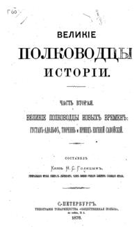 «Великие полководцы истории» являются закономерной работой в рамках грандиозного проекта князя Голицына — «Всеобщей военной истории». Используя общепризнанные критерии по определению значимости деятельности военачальников, автор отбирает малый круг лиц, внёсших наибольший вклад в развитие военной науки. Второй том содержит подробное описание жизни трёх великих полководцев: шведского короля Густава-Адольфа, французского маршала Анри Тюренна и австрийского принца Евгения Савойского. Каждый из них наследовал другому, развивая военное искусство предшественника. Три этих человека создали основы использования больших пехотных масс, вооружённых огнестрельным оружием, возможность операций на больших фронтах действий, необходимость тщательной планировки собственных коммуникаций и уничтожение вражеских — они по сути разработали правила, по которым велись войны на протяжении следующих трёх веков. Книга опирается на большое количество иностранных оригинальных источников и исследования самых авторитетных военных специалистов, снабжена многочисленными картами и иллюстрациями.