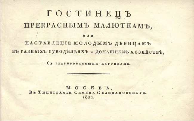 Гостинецъ прекраснымъ малюткамъ, или Наставленiе молодымъ дѣвицамъ в разныхъ рукодѣлияхъ и домашнемъ хозяйствѣ