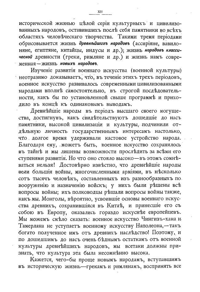 Стараясь выполнить эту программу, а также желая возможно нагляднее показать зависимость состояния военного искусства данной эпохи от современного состояния культуры и цивилизации, главные отделы настоящего сочинения сопровождаются общеисторическими данными, сгруппированными по столетиям. В приведенных перечнях событий указаны только важнейшие научные и практические изобретения, течения в области философии, науки и искусства.
