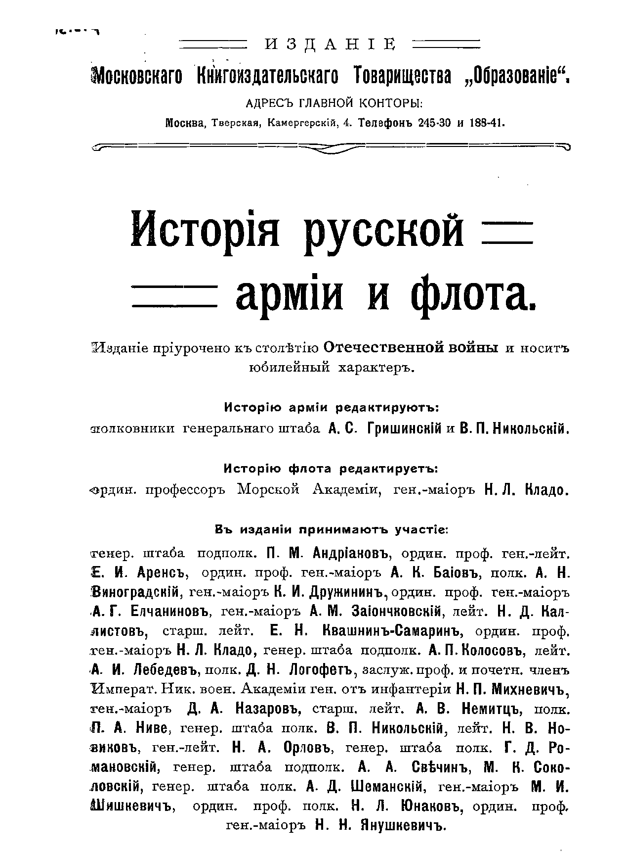 «История» рисует картину постепенного развития русского военного дела. С особым вниманием издание останавливается на наиболее выдающихся боевых эпизодах, интересуясь в тоже время организацией, бытом, вооружением и боевой подготовкой наших войск, в связи с политической жизнью государства. «История русской армии и флота» по своим размерам ( до 170 печатных листов) значительно превосходит прежние издания этого рода. Снабженная большим количеством иллюстраций и фотографий, она предназначалась для просвещения и русского офицерства, и русского общества.