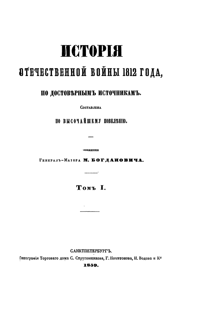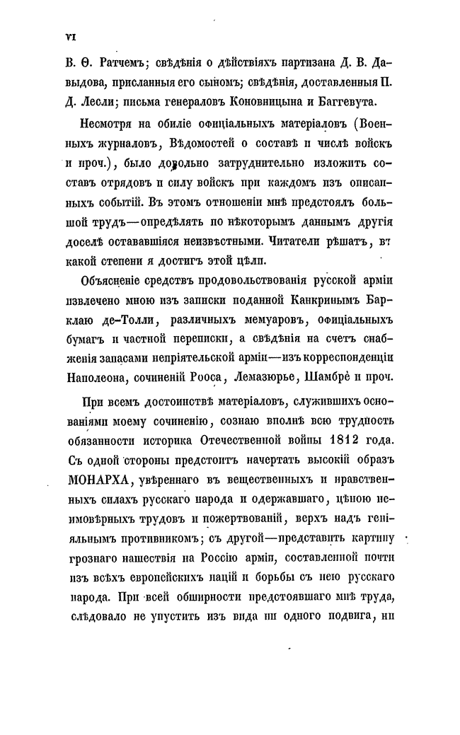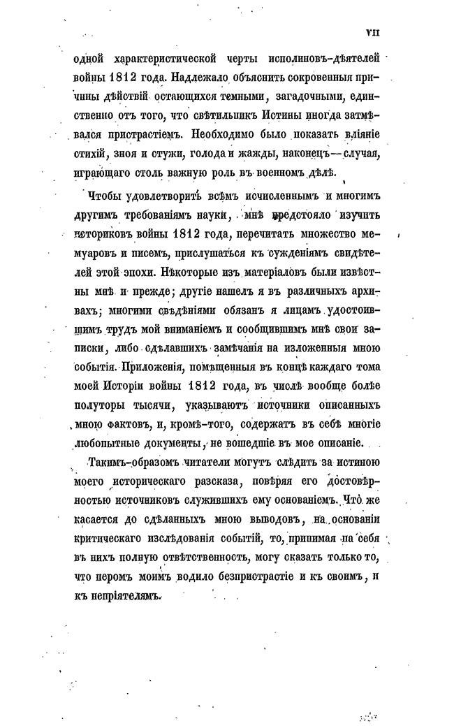 Автор считает своей обязанностью, с одной стороны, начертать высокий образ монарха, уверенного в вещественных и нравственных силах русского народа и одержавшего ценой неимоверных трудов и пожертвований верх над гениальным противником, с другой – представить картину грозного нашествия на Россию армии, составленной почти из всех европейских наций, и борьбы с ней русского народа. Автор специально указывает на то, что в своих выводах, основанных на критическом исследовании событий, он руководствовался беспристрастным отношением и к своим, и к неприятелю.