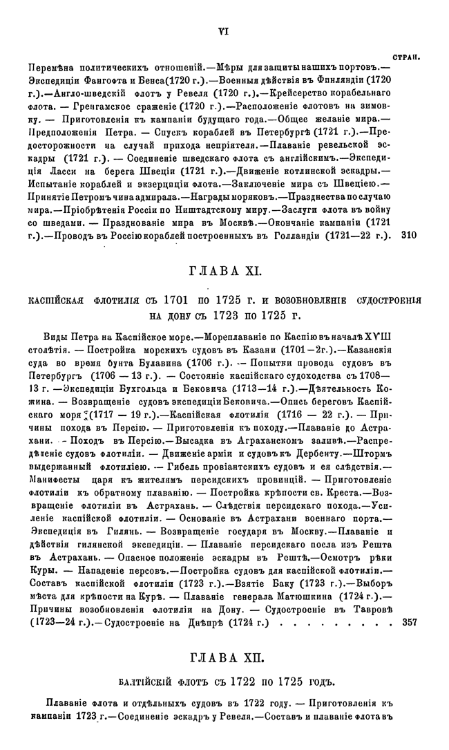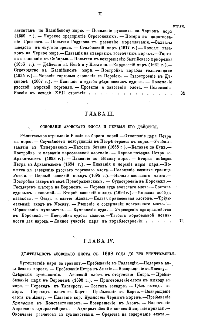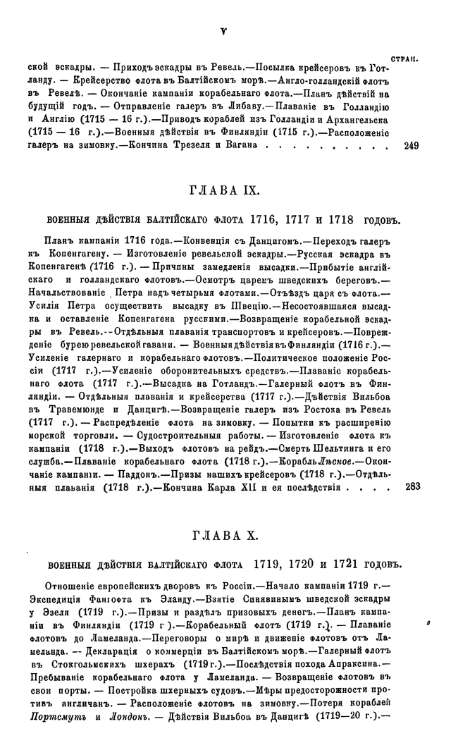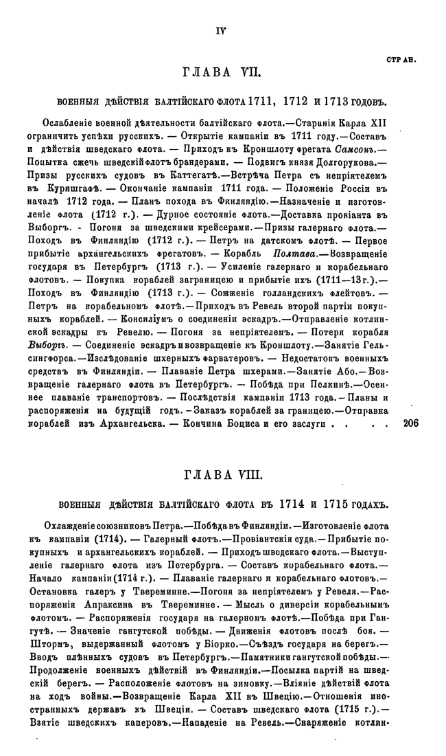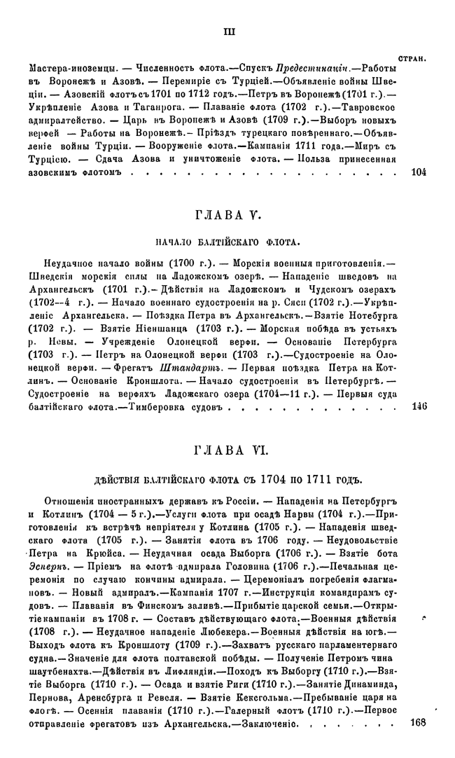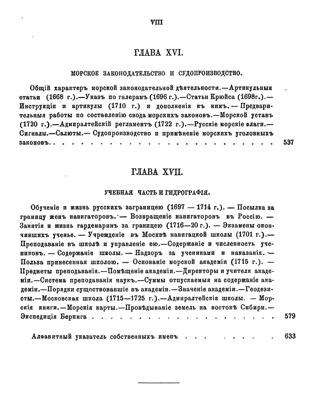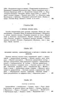 В первых двенадцати главах в хронологическом порядке изложены события, относящиеся преимущественно до русской военно-морской истории. В последних же пяти сгруппированы описания других родов морской деятельности, имеющих значение для истории русского флота.