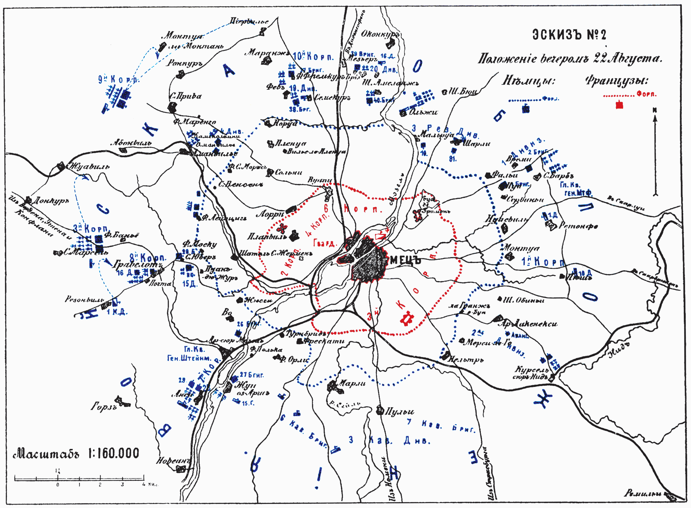 События и бои под Мецом с начала обложения до капитуляции. От 19 августа до 27 октября 1870 года. Эскиз №2. Положение вечером 22 Августа