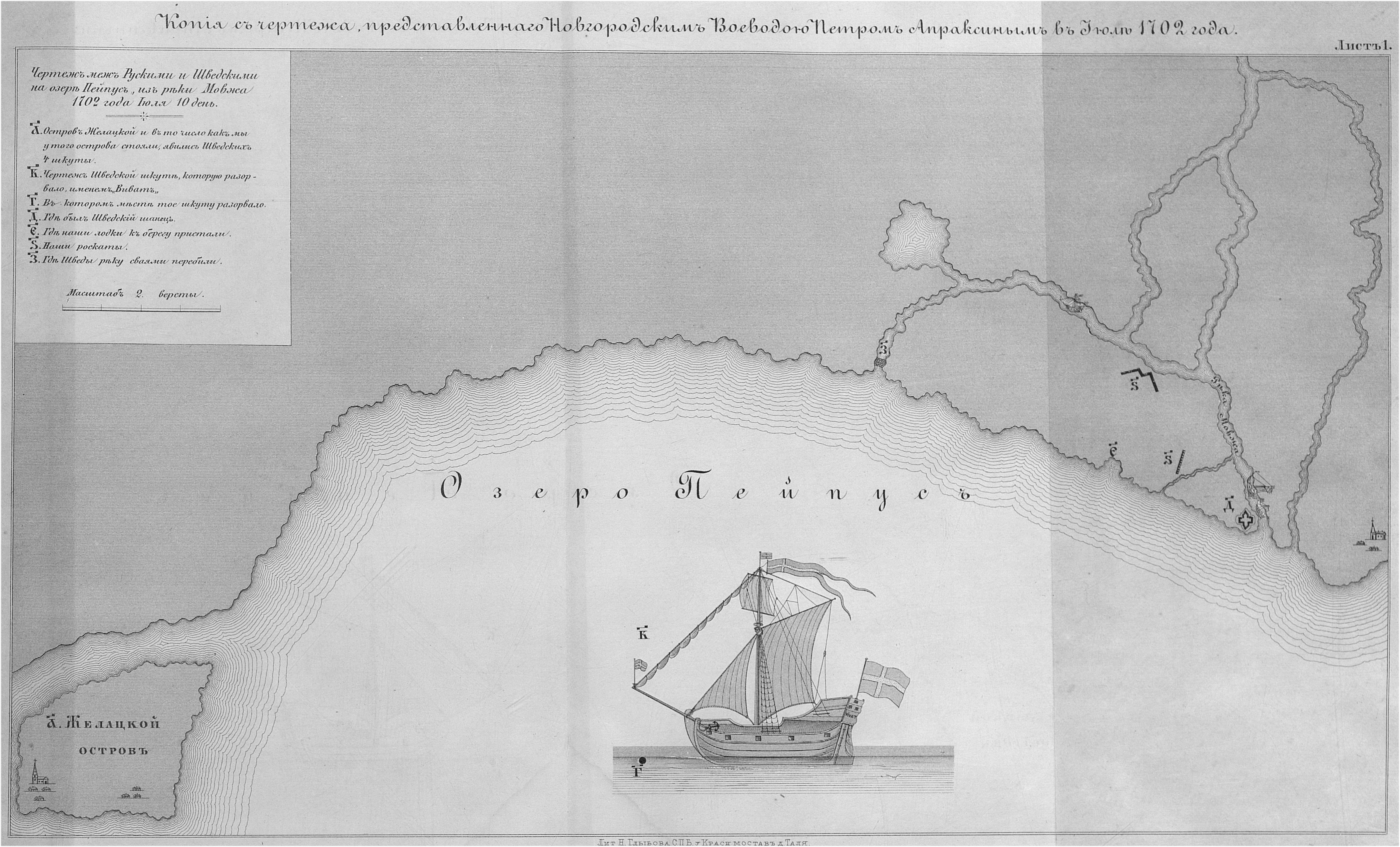 Копия с чертежа части озера Пейпус с изображением шведской шкуты "Виват" 1702 года