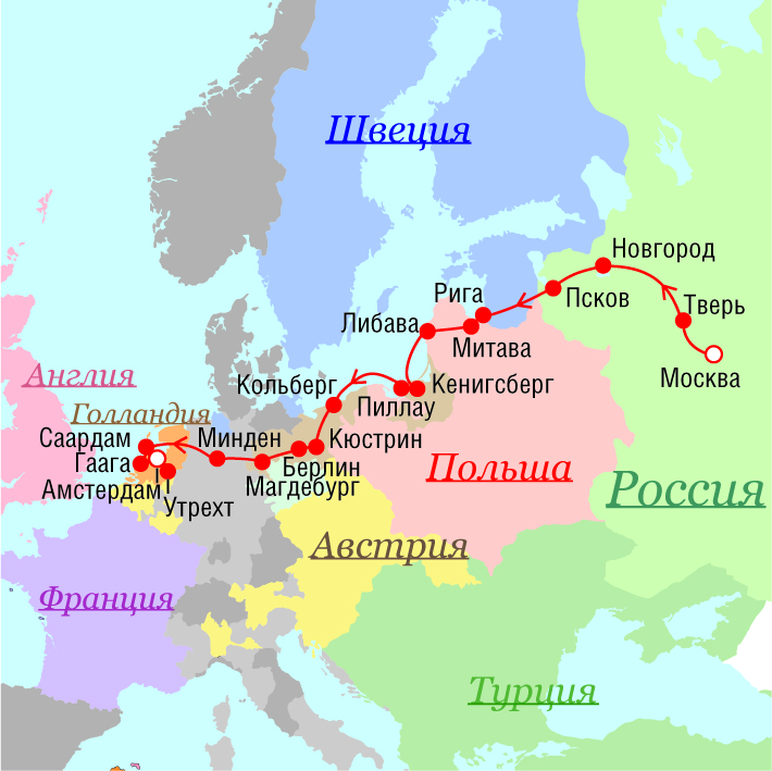 Маршрут поездок Петра I - 1697 г.