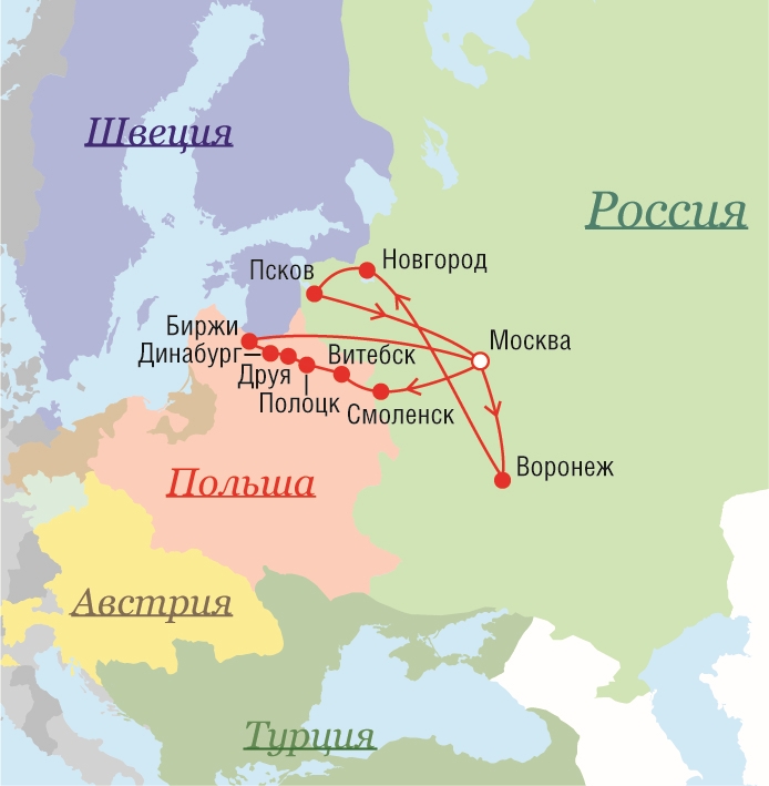 Маршрут поездок Петра I - 1701 г.