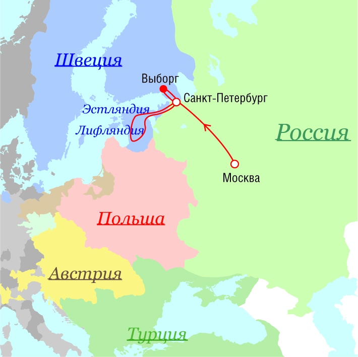 На карте указаны маршруты путешествий Петра I на каждый год. Расстояния приблизительно вычислены по российским дорожникам XVIII и XIX вв. Различия в длине маршрутов Петра и современного пути объясняются другой сеткой дорог. Длина маршрутов, на которые данные дорожников отсутствуют, была определена по электронным картам.