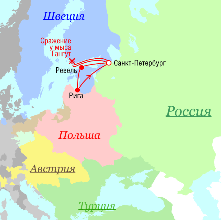 На карте указаны маршруты путешествий Петра I на каждый год. Расстояния приблизительно вычислены по российским дорожникам XVIII и XIX вв. Различия в длине маршрутов Петра и современного пути объясняются другой сеткой дорог. Длина  маршрутов, на которые данные дорожников отсутствуют, была определена по электронным картам.