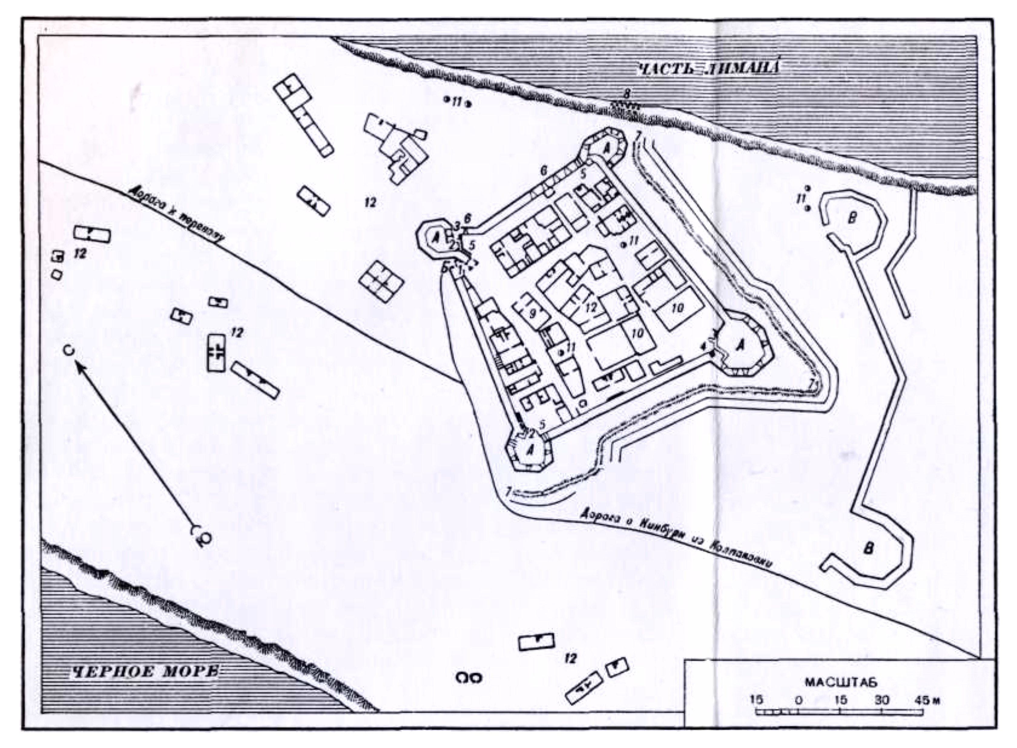 Крепость Кинбурн. Чертеж, выполненный на основании рукописного плана 1775 года. (Центральный Государственный архив древних актов)