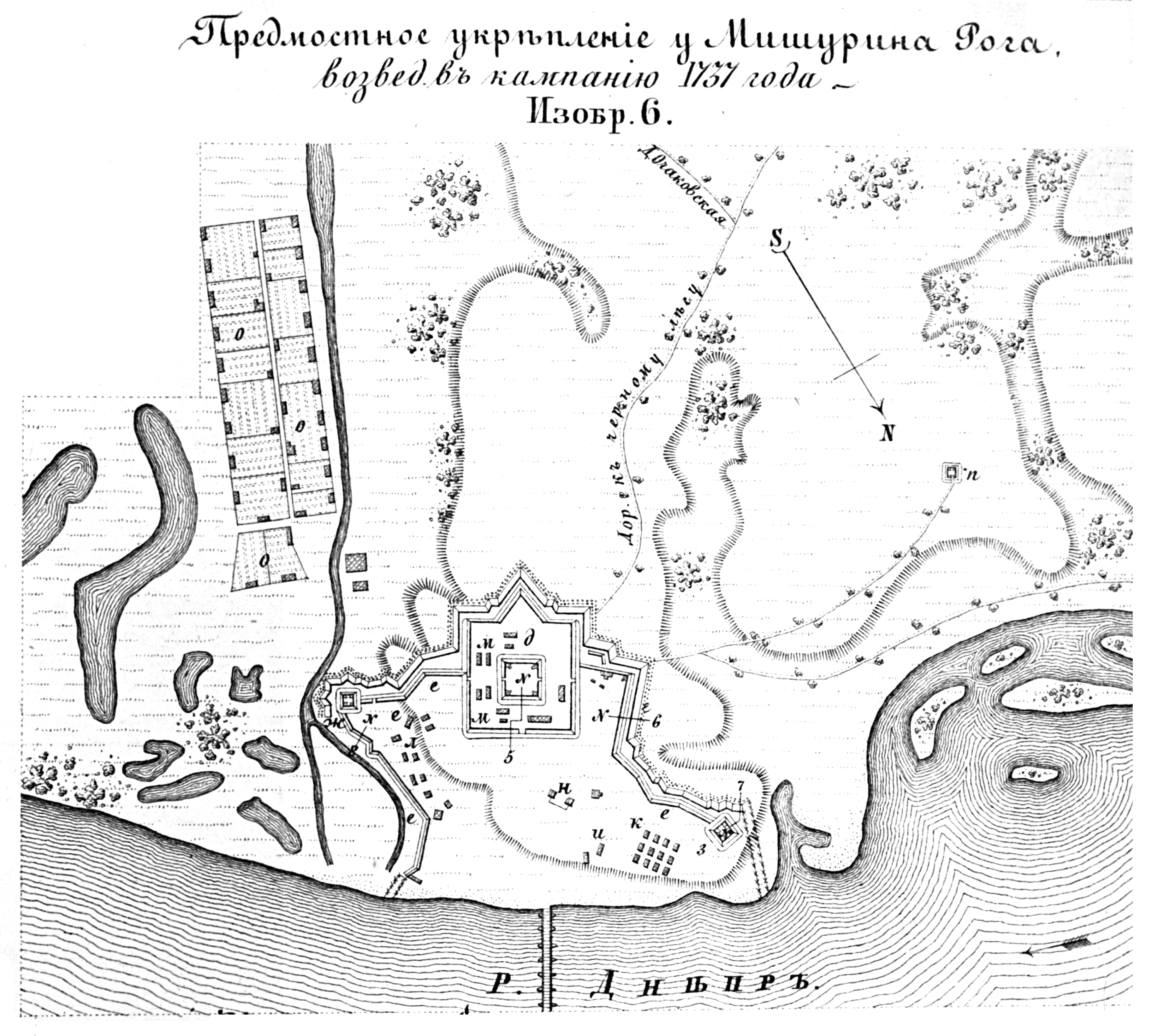 Полевые и временные укрепления. Изобр.6. Предместное укрепление у Мишурина Рога, возведенное в кампанию 1737 года
