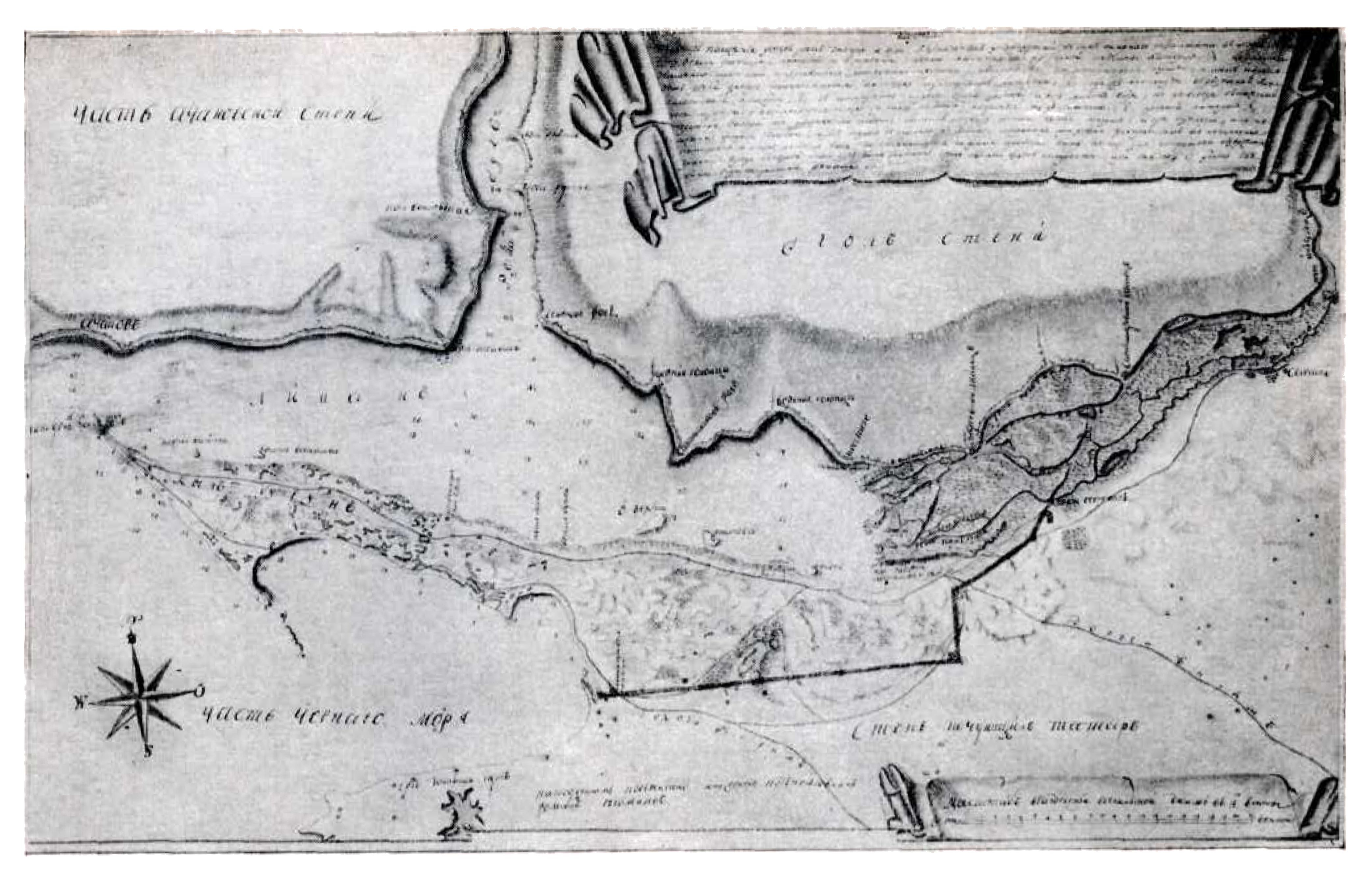 Кинбурнская коса и берег Днепровско-Бугского лимана с границей округа, отошедшего к России в силу статьи 18 Кючук-Кайнарджийского договора. Рукописная карта XVIII века (Государственный Исторический музей)