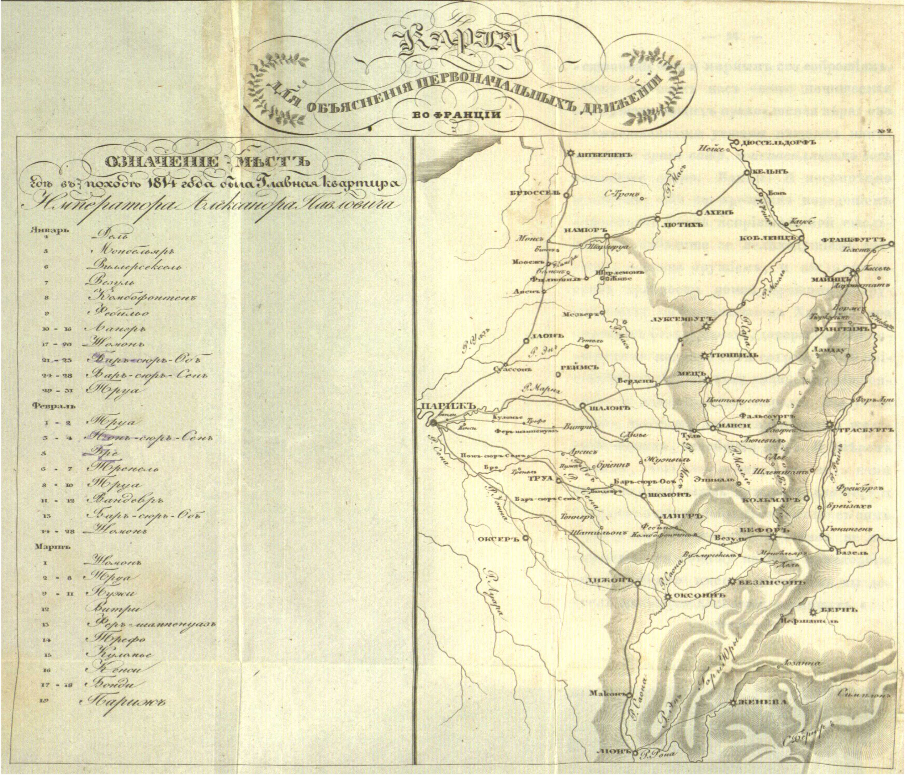 Первоначальные движения во Франции с обозначением мест, где в походе 1814 года была Главная квартира Императора Александра Павловича