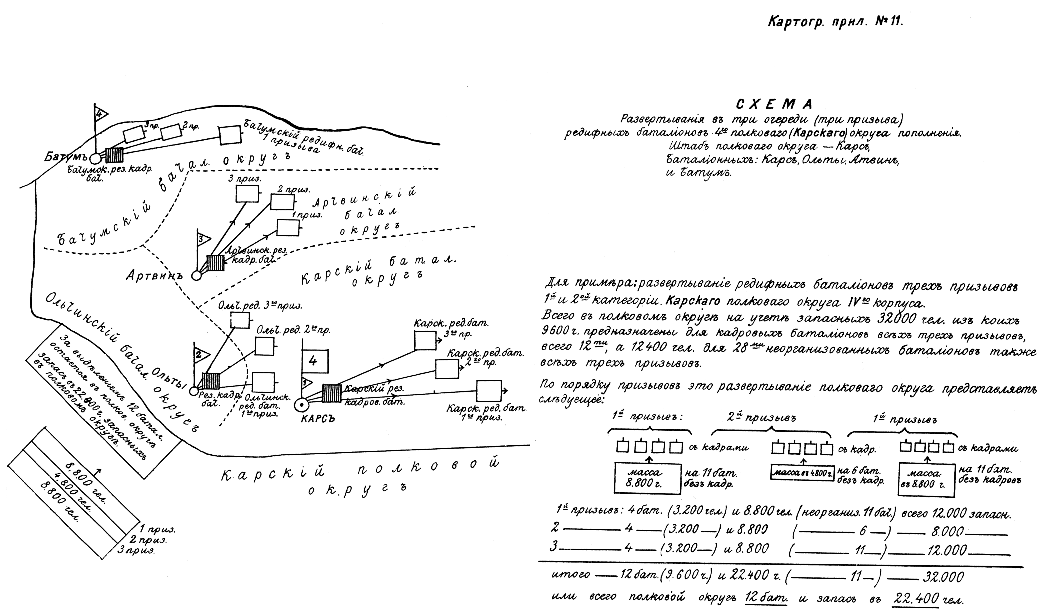 Развертывание в три очереди (три призыва) редифных батальонов 4-го полкового (Карского) округа пополнения