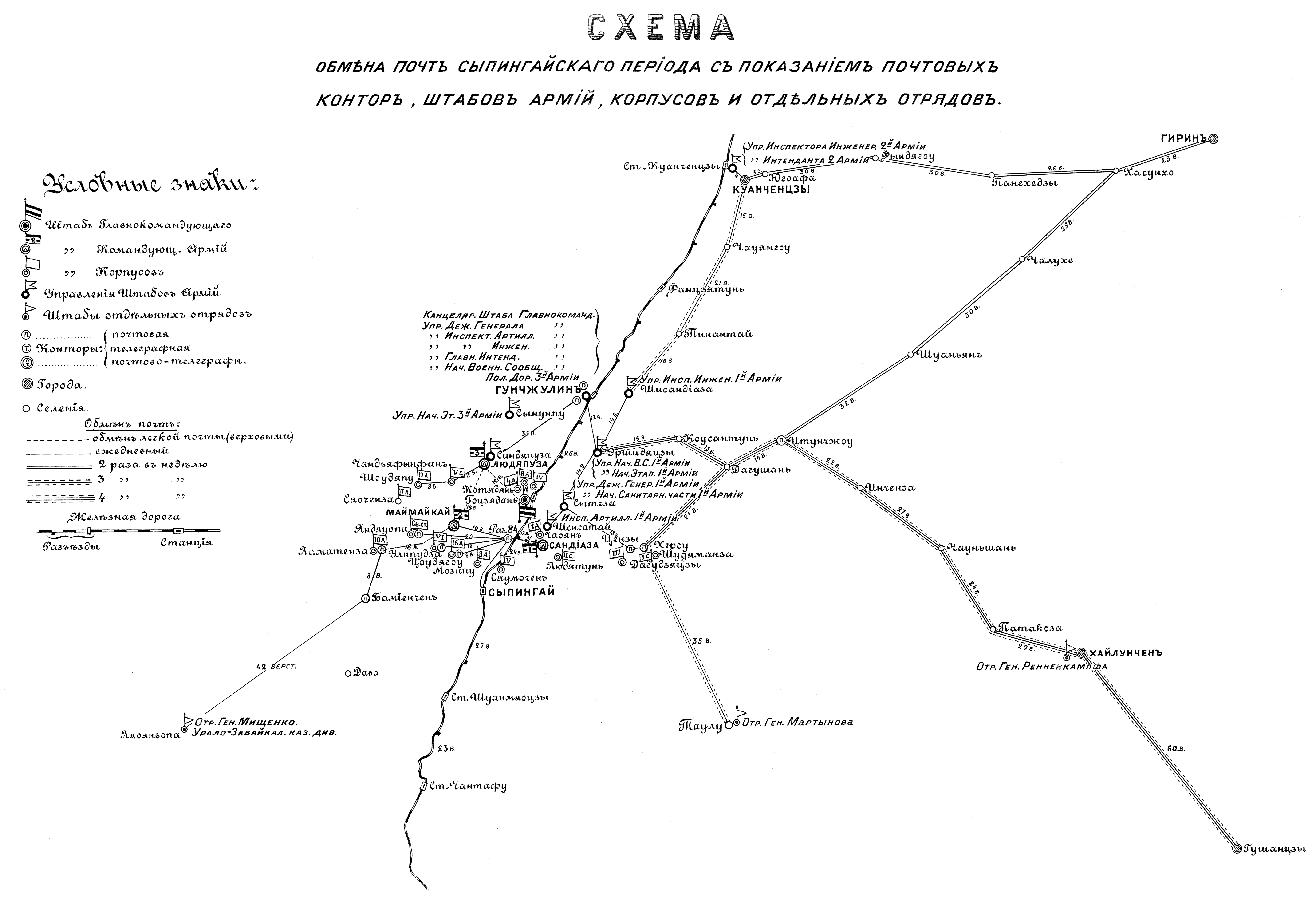 Обмен почты Сыпингайского периода с показанием почтовых контор, штабов армий, корпусов и отдельных отрядов