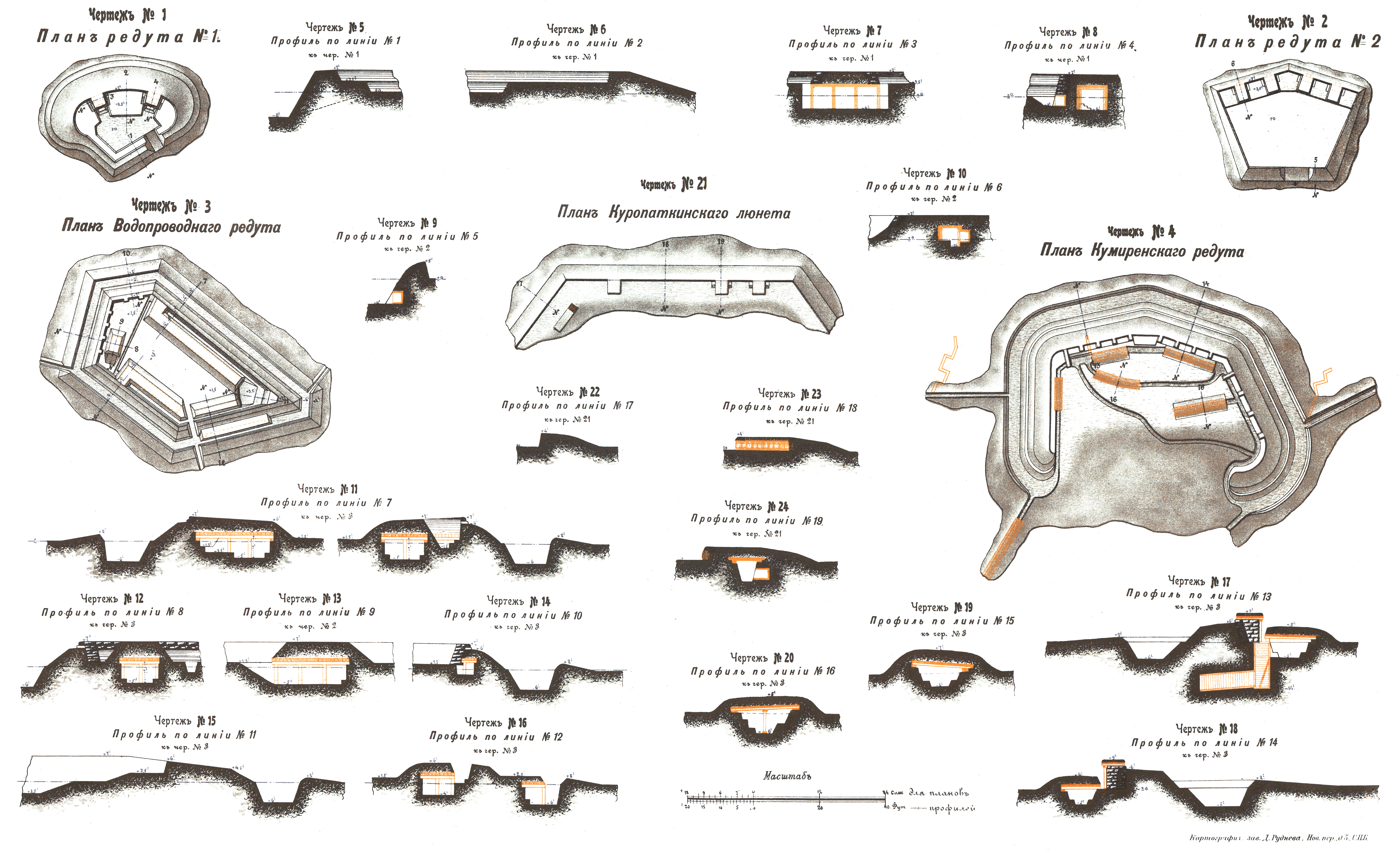 Чертежи редутов Водопроводного, Кумиренского, №1 и №2 и Куропаткинского люнета