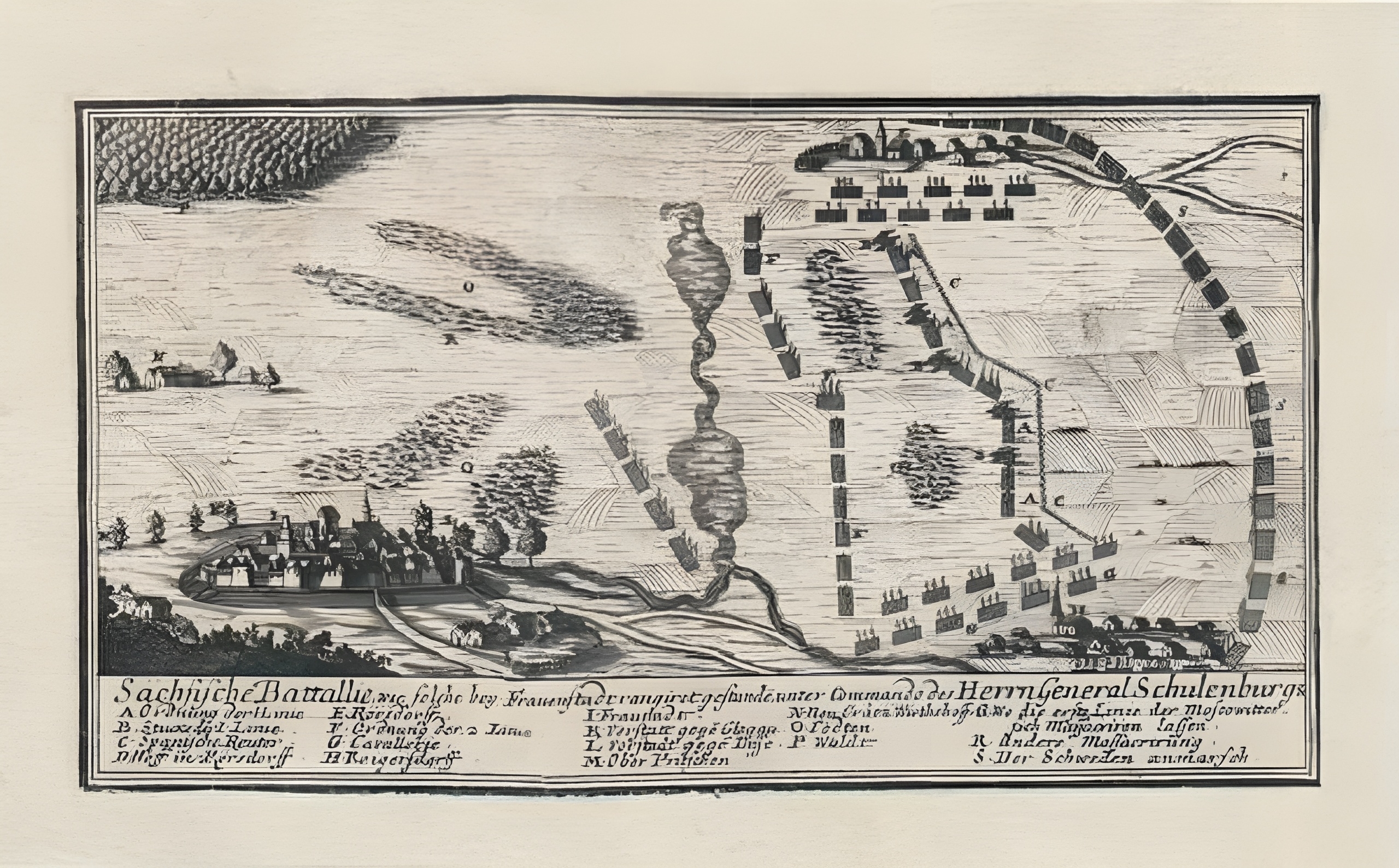Историческая карта-схема битвы при Фрауштадте (современная Всхова, Польша), которая произошла 13 (3) февраля 1706 года в ходе Великой Северной войны. Карта показывает боевое построение саксонско-русской армии под командованием генерала Шуленбурга перед сражением со шведскими войсками генерала Реншильда.