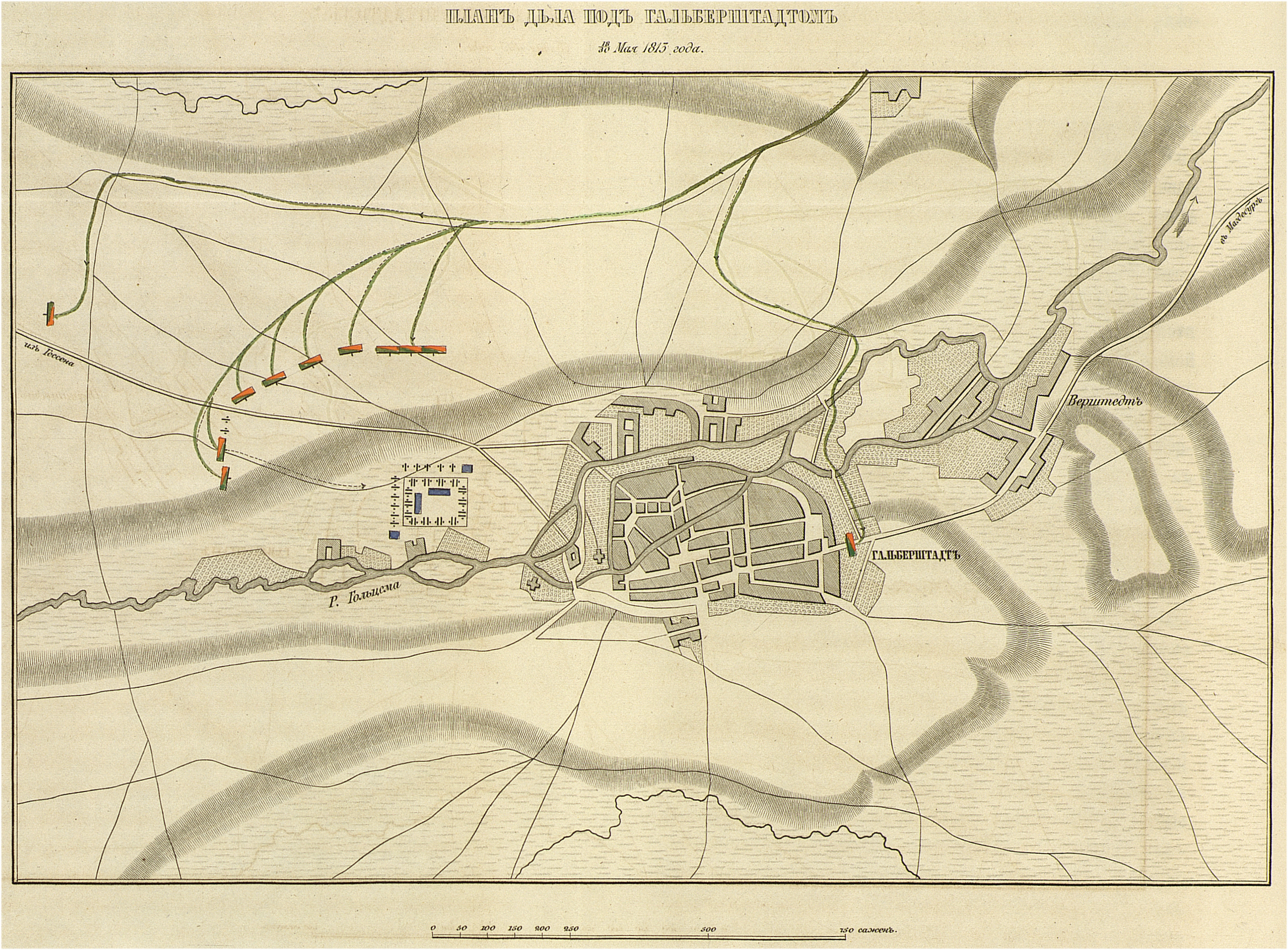 <div id="imgunder"><a href="http://www.runivers.ru/bookreader/book9706/#page/390/mode/1up">Читать о сражении подробнее в издании: Богданович Модест Иванович. История войны 1813 года за независимость Германии: Том I.— СПб., 1863.</a></div>