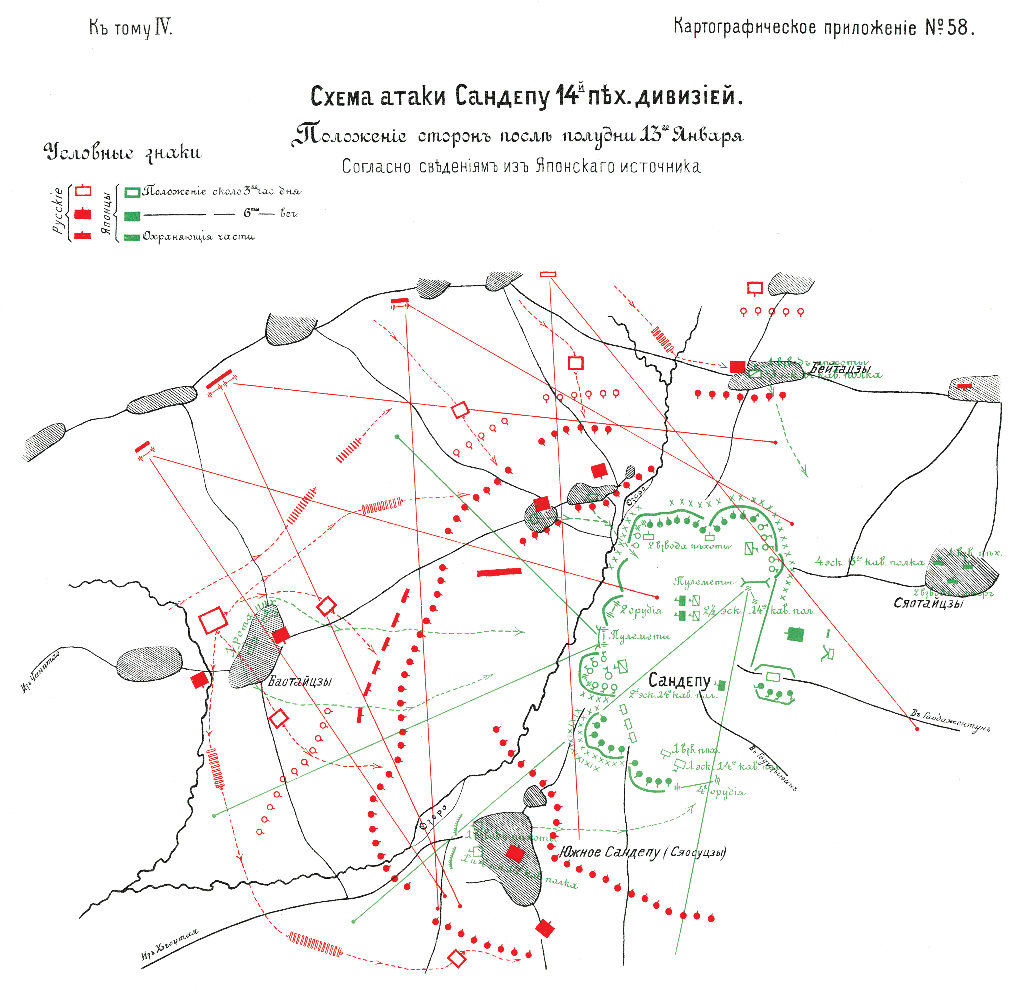 Атака Сандэпу 14 пехотной дивизией. Положение сторон после полудня 13 января. Согласно сведениям из Японского источника