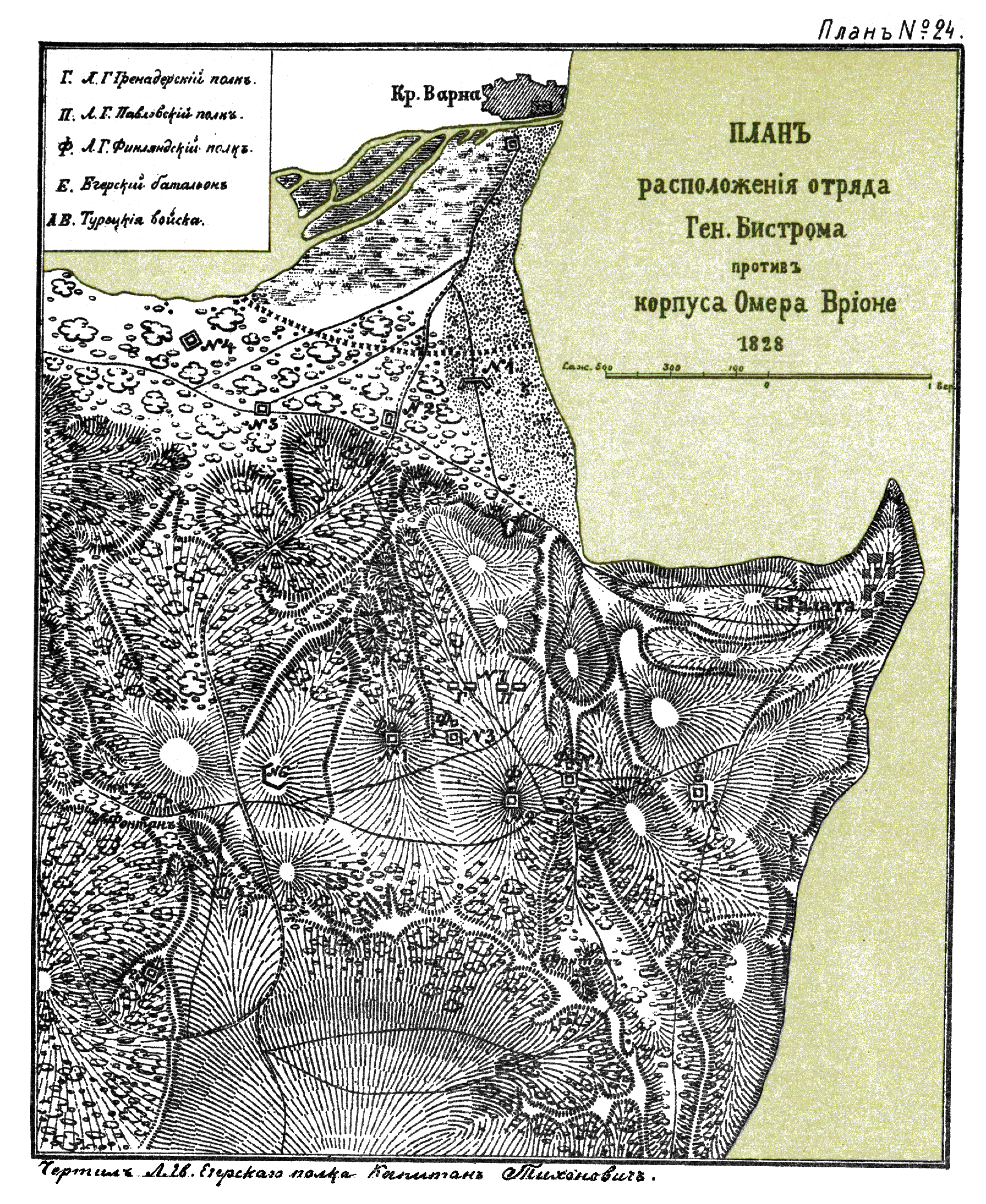 План расположения отряда Генерала Бистрома против корпуса Омера Врионе 1828 год