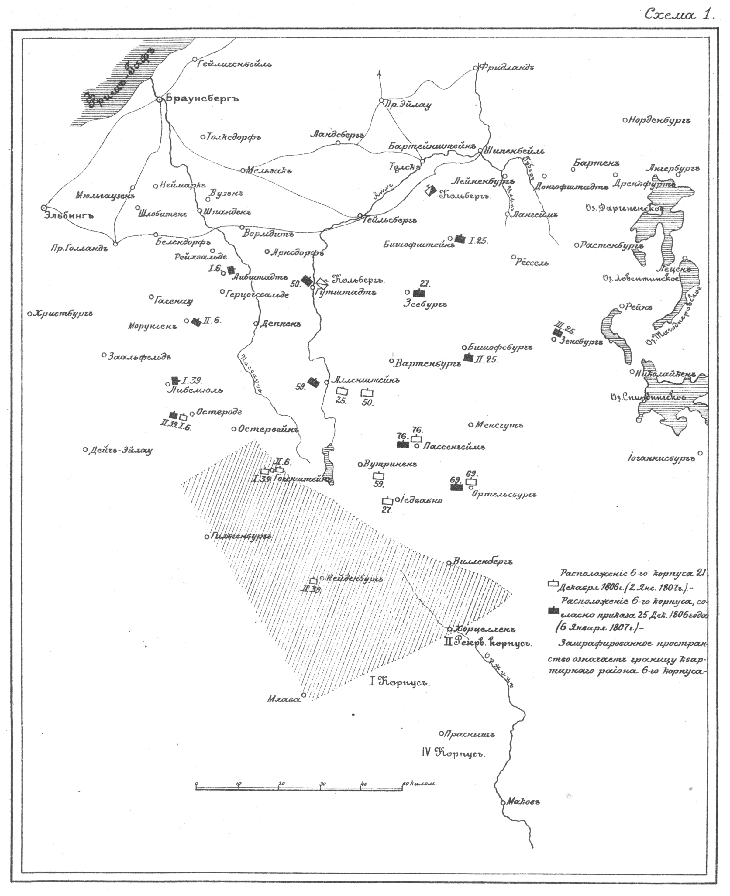 Расположение французского 6-го корпуса 21 и 25 декабря 1806 года  (2 и 6 января 1807 года)