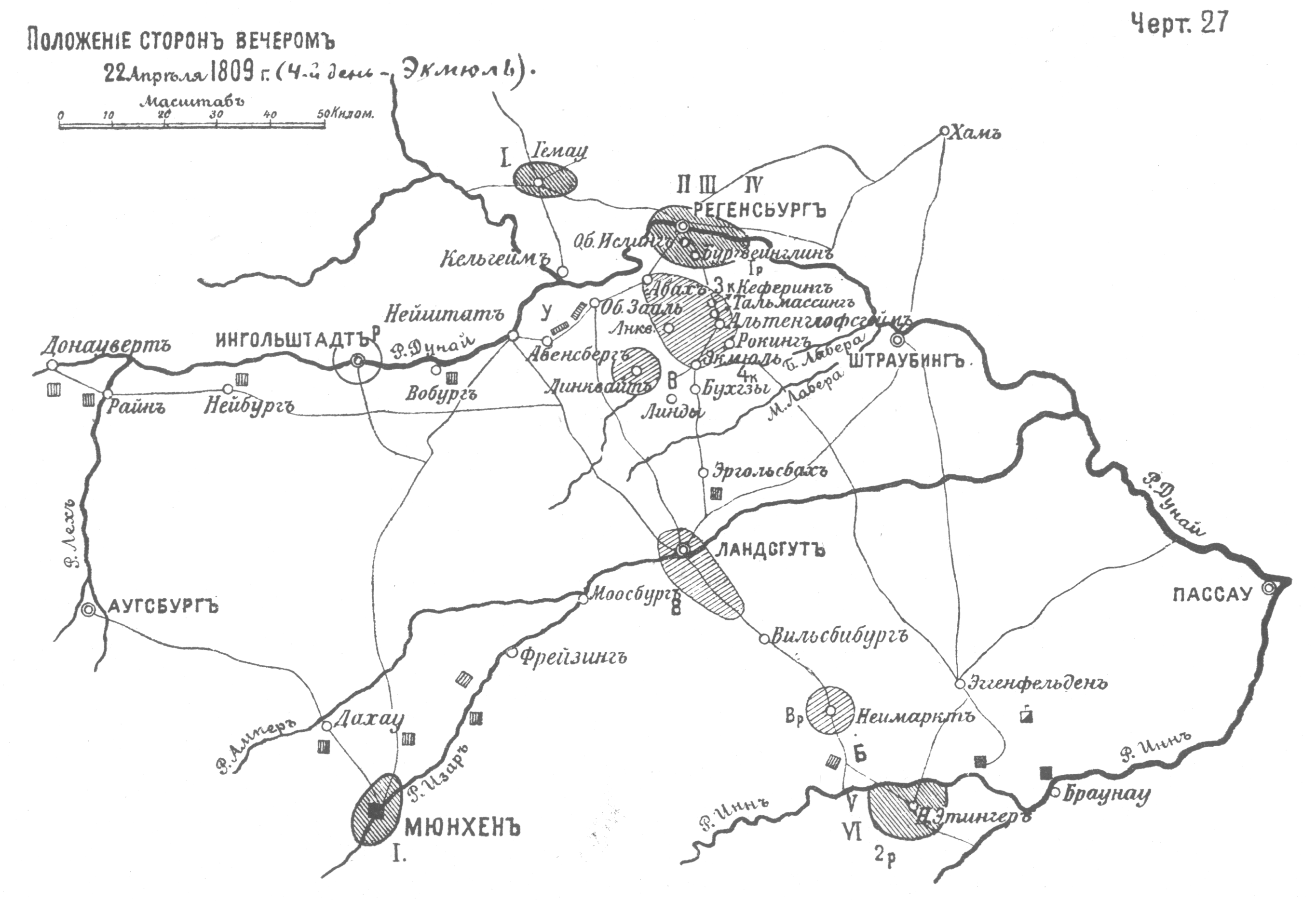 Положение сторон вечером 22 апреля 1809 года (Четвертый день - Экмюль)