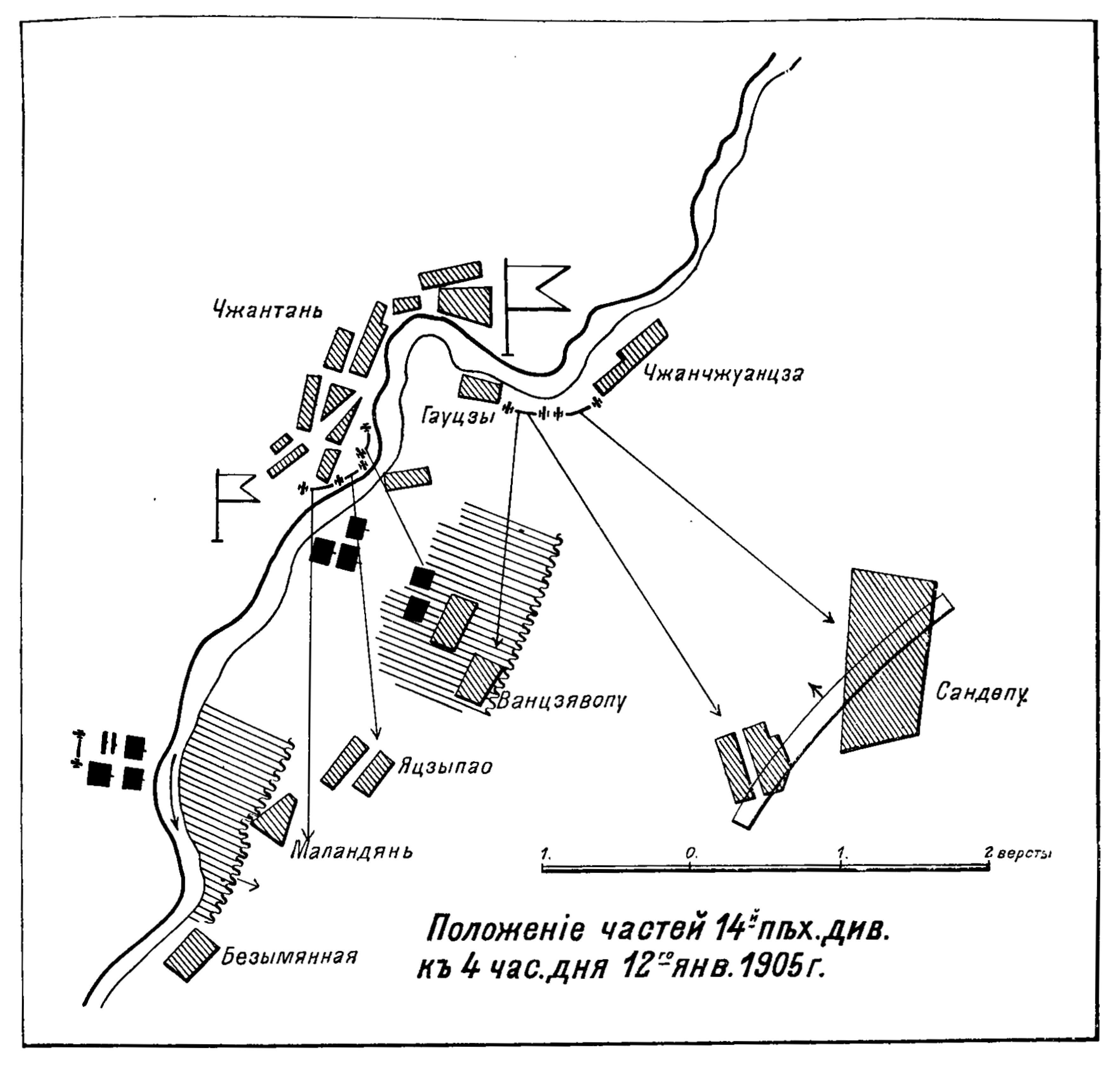 Положение частей 14-й пехотной дивизии к 4 часам дня 12 января 1905 года