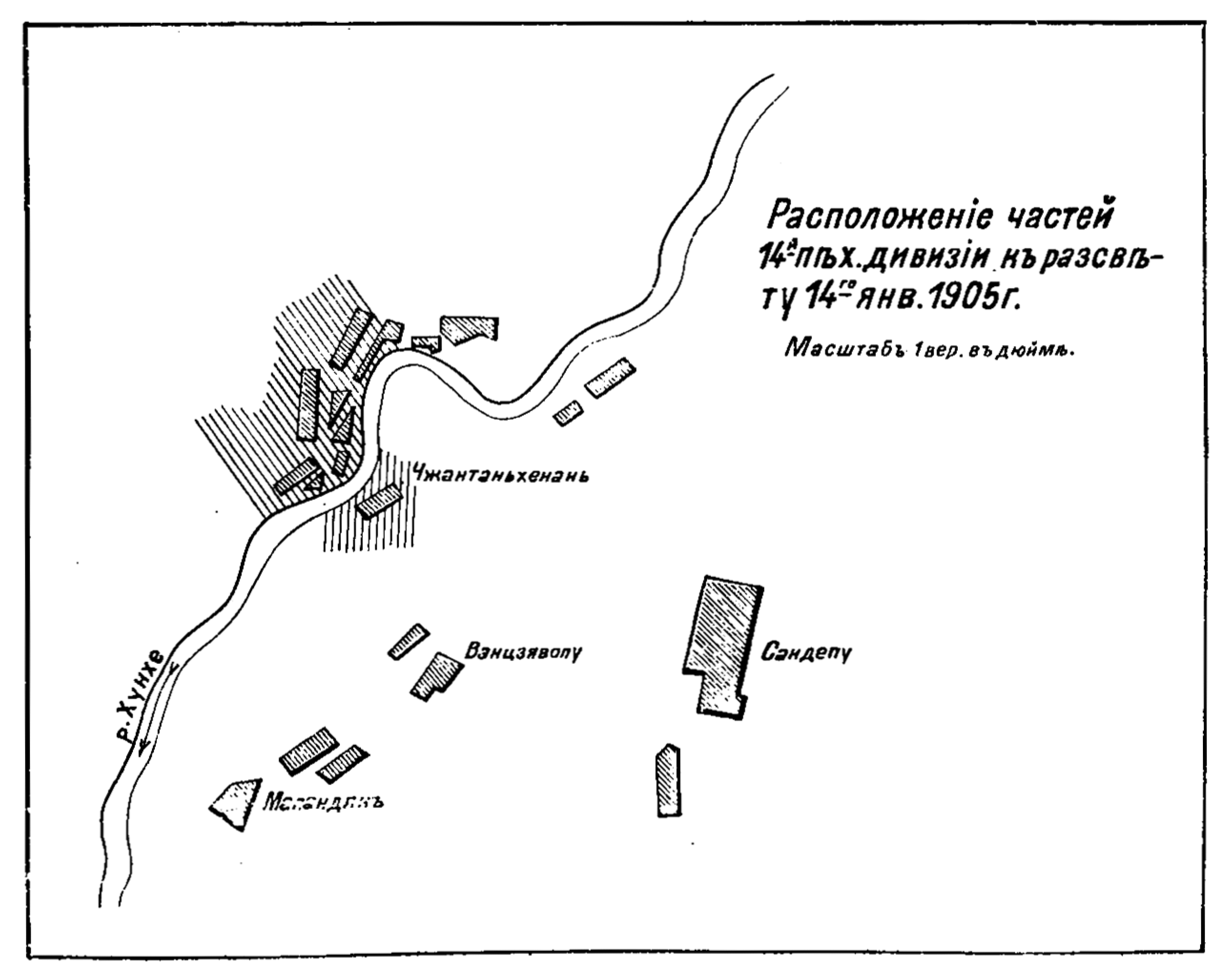 Схема расположения частей 14-ой пехотной дивизии к 4 часам дня 13 января 1905 года
