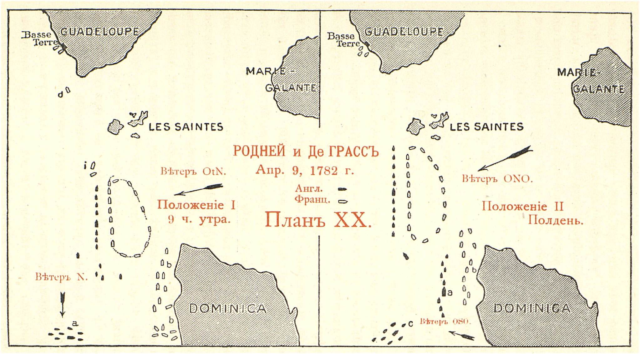 Сражение между Роднеем и де Грассом 9 апреля 1782 года. Положение в 9 ч утра и в полдень