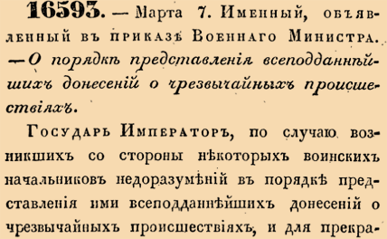 Закон № 16593. - 1843 год. 7 марта (19 марта). Именной указ, устанавливающий порядок прямого дублирующего доклада императору о чрезвычайных происшествиях в военном ведомстве для устранения задержек в информировании.
