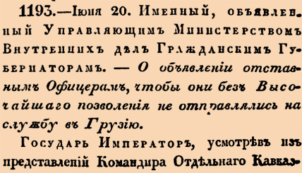 1193. 1827 год. 20 июня (2 июля). Именный, объявленный Управляющим Министерством Внутренних дел Гражданским Губернаторам. О объявлении отставным Офицерам, чтобы они без Высочайшаго позволения не отправлялись на службу в Грузию.
