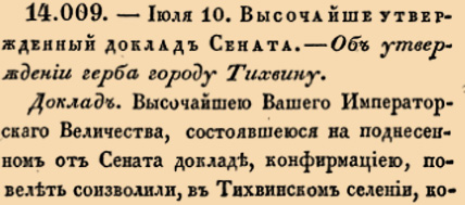 14009. 1773 год. 21 июля (10 июля ст.ст.) Высочайше утвержденный доклад Сената. Об утверждении герба городу Тихвину.Описание герба городу Тихвину. Щит разрезанный на двое дугою серебряною, означающий часть Зодиака, на корой изображен черными литерами год учреждения сей слободы городом; верхняя часть щита голубая, на которой сверху происходит золотое сияние, показующее, что сие м есто и прежде было знаменито <...>