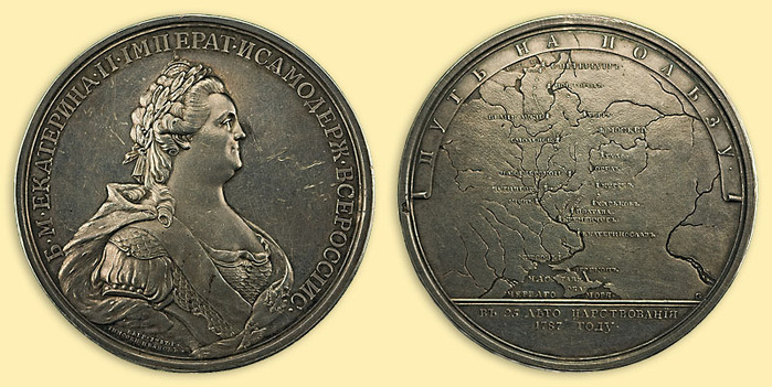 Памятная медаль, выбитая в честь путешествия Екатерины II. 1787 год
