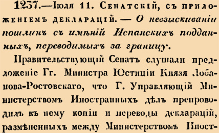 1237. 1827 год. 23 июля (11 июля ст.ст.) Сенатский, с приложением деклараций. О невзыскивании пошлин с имений Испанских подданных, переводимых за границу<…> Производимый в казну Государственную вычет, за вывоз и перевод за границу наследственных и других имений иностранцев, отменить в пользу подданных тех Держав, которыя взаимно постановят во владениях своих таковую же отмену в пользу Российских подданных<…>