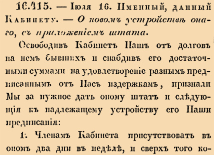 16415. 1786 год. 27 июля (16 июля ст.ст.) Именный, данный Кабинету. О новом устройстве онаго, с приложением штата1.Членам Кабинета присутствовать в оном два дни в неделе, и сверх того когда случится нужное дело требущее общаго их разсуждения и положения. Произшествия каждаго заседания вносить в дневную записку, которую наличным Членам подписать; а буде кто случится и в отлучке, то по возвращении обязан будет все оное пересмотрев подписать, или подать свое примечание для чего он подписать не может <…>
