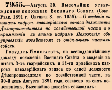 7955. 1891 год. 30 августа (11 сентября). Высочайше утвержденное положение Военнаго Совета. О введении в штат кадров кавалерийскаго запаса должности Делопроизводителя по хозяйственной части и о применении к этим кадрам Положения об управлении хозяйс...