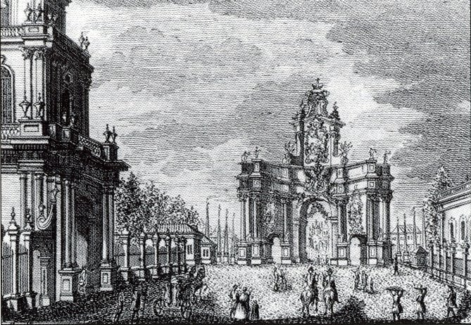 Триумфальные ворота к коронации Екатерины II на Тверской улице у Белого города (архитектор К.И.Бланк). Гравюра по рисунку М.И.Махаева.