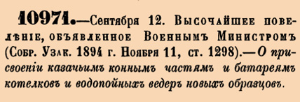 10971. 1894 год. 12 сентября (24 сентября). Высочайшее повеление, объявленное Военным Министром. 4. О присвоении казачьим конным частям и батареям котелков и водопойных ведер новых образцов.