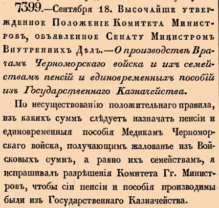 7399. 1834 год. 30 сентября (18 сентября ст.ст.) Высочайше утвержденное Положение Комитета Министров, объявленное Сенату Министром Внутренних Дел. О производстве Врачам Черноморскаго войска и их семействам пенсий и единовременных пособий из Государственнаго Казначейства.По несуществованию положительнаго правила, из каких сумм следует назначать пенсии и единовременныя пособия Медикам Черноморскаго войска, получающим жалованье из Войсковых сумм, а равно и их семействам, я испрашивал разрешения Комитета Гг.Министров, чтобы сии пенсии и пособия производимы были из Государственнаго Казначейства <…>